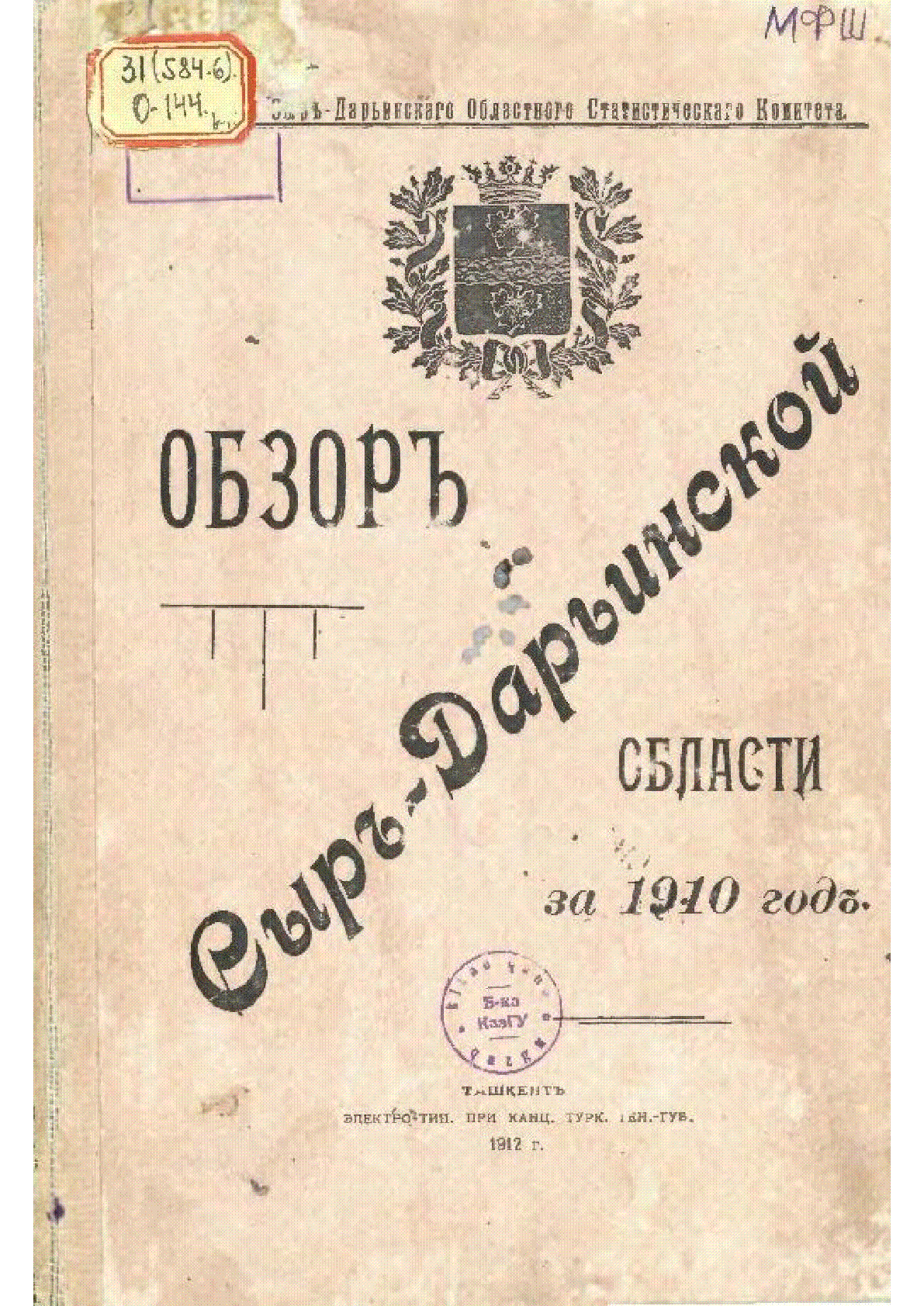 Обзор Сыр-Дарьинской области за 1910 год [Текст] / ... – Ташкент : Электро- тип. при канц. Турк. Ген. Губ., 1912. - 193 стр. . . – б.т.