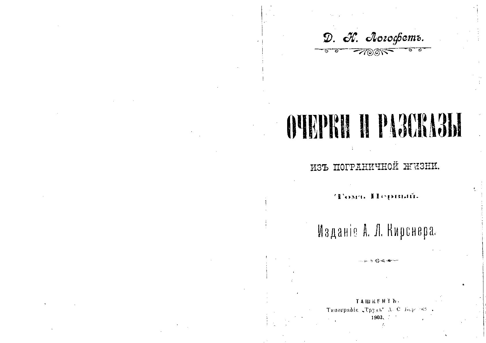 Очерки и рассказы из пограничной жизни [Текст] : [в 2 т.] / Д. Н. Логофет- Ташкент : Издание А. Л. Кирснера : Тип. Труд В. А. Березовский , 1903.– [б. т.] . - Текст на старорус. яз. . Т. 1 .– 252, [1] c.