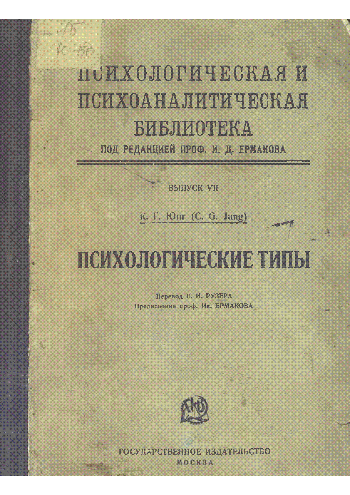 Психологические типы [Текст] / К. Г. Юнг ; предисл. И. Д. Ермакова; пер. Е. И. Рузера... – Москва : Госиздат, [1924]. - 96 с.– (Психологическая и психоаналитическая библиотека. / под ред. И. Д. Ермакова ; вып. 7 . . – 4000 экз.