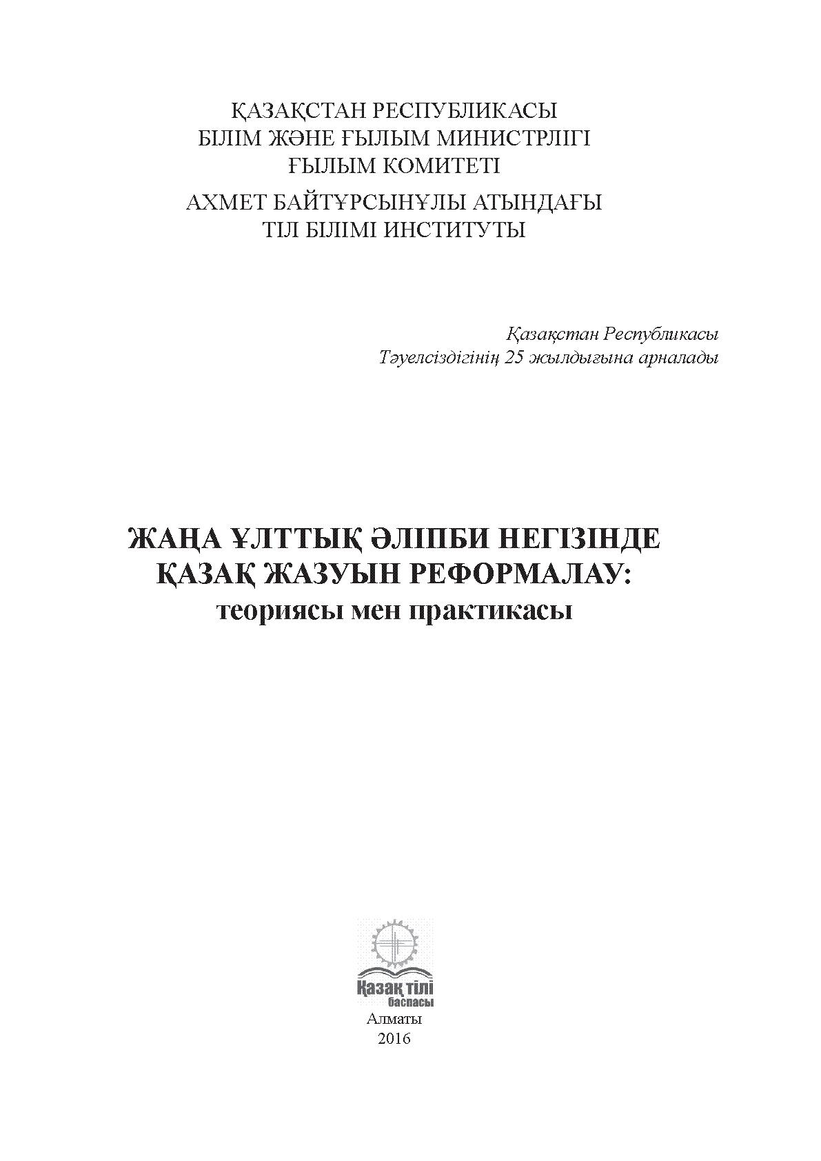 Жаңа ұлттық әліпби негізінде қазақ жазуын реформалау: теориясы мен практикасы [Мәтін] : [ұжымдық монография] / ; [жалпы ред. басқ. А. Фазылжанова ; жауап. ред.: А. Хабиева, А. Аманбаева] ; ҚР Білім және ғылым министрлігі ; Ғылым комитеті ; А. Байтұрсынұлы атын. Тіл білімі ин-ты... – Алматы : Қазақ тілі, 2016. - 554, [4] б., суретті; - ҚР Білім жəне ғылым министрлігі Ғылым комитеті 2013-2015 жылдарға арналған бағдарламалық-мақсаттық қаржыландыру аясында жүзеге асырылған «Қазақ жазуын жаңа ұлттық əліпбиге көшірудің ғылыми негіздерін кешенді зерттеу» атты ғылыми-зерттеу бағдарламасы негізінде, ҚР Тәуелсіздігінің 25 жылдығына арналады . . – 300 дана – ISBN 978-601-80411-9-8 (мұқ.) : 40 тг.
