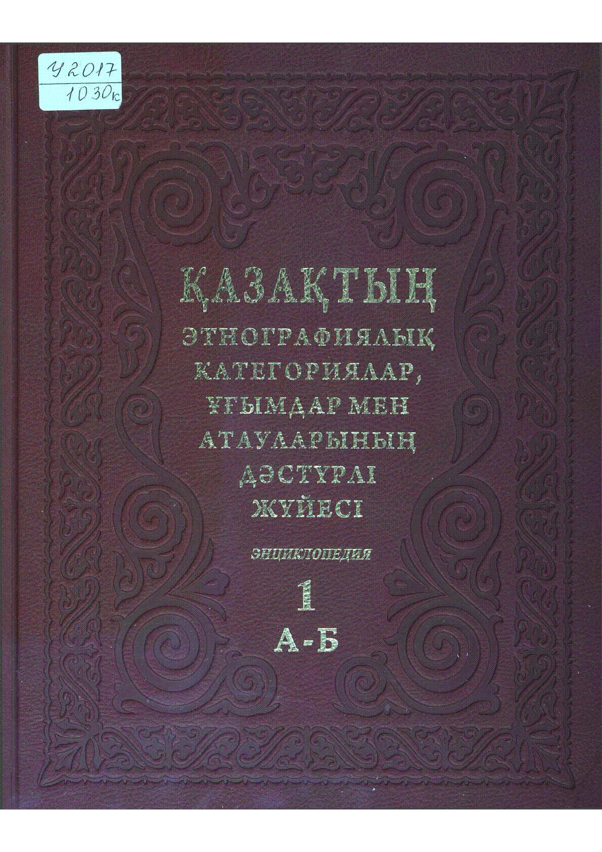 Қазақтың этнографиялық категориялар, ұғымдар мен атауларының дәстүрлі жүйесі [Мәтін] : энциклопедия ; [ғылыми ред. Н. Әлімбай. Н. Уәли; редакция алқасы Ә.Ахметов [т. б.]]; ҚР Мәдениет және спорт министрлігі, ҚР мемлекеттік орталық музейі .- Алматы : Алем Даму Интеграция , 2017. – 978-601-252-087-3, – 5000 дана . – 978-601-252-088-0 (т.1) (мұқ.) - "ҚР Мәдениет және спорт министрлігі "Әдебиеттің әлеуметтік маңызды түрлерін басып шығару" бағдарламасы бойынша жарық көрді" ; Мәтін қазақ, орыс, ағылшын . Библиогр.: 805-855 б. Т. 1 . А - Б– 855 б., суретті . (мұқ.) : 11060 тг. 28 тн.