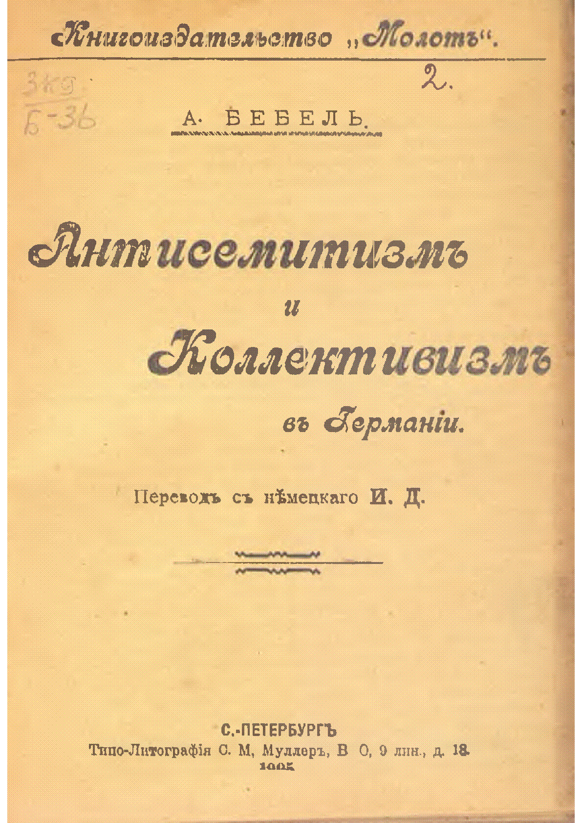 Антисемитизм и коллективизм в Германии [Текст] : перевод с немецкого И. Д. / А. Бебель ... – Санкт-Петербург : Книгоизд-во "Молот", 1905. - 32 с. . – Библиогр. в подстроч. примеч. . – [б. т.]