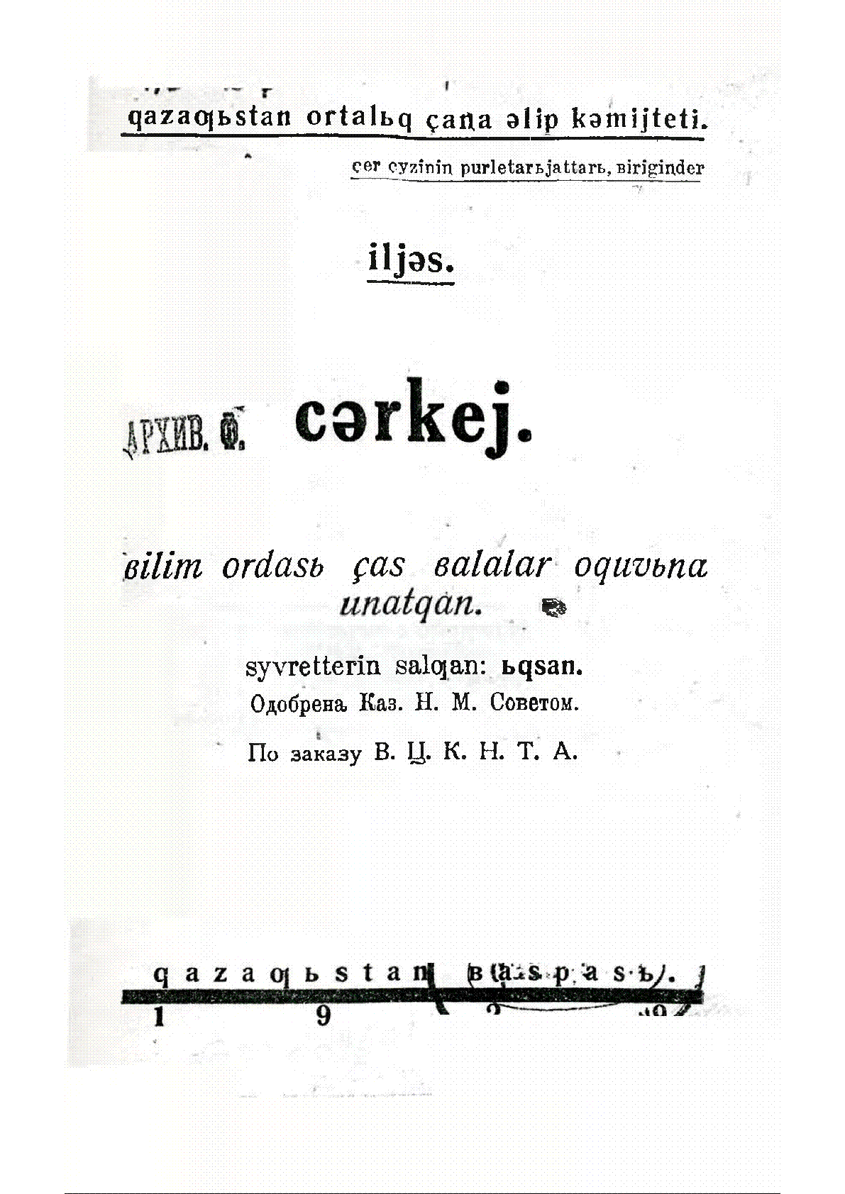 Шәркей [Мәтін] : білім ордасы жас балалар оқуына ұсынған : жер жүзінің пролетарлары, бірігіңдер / І. Жансүгіров ; сур. Ықсан ; Қазақстан орталық жаңа әріп комитеті... – Қызыл-орда : Қазақстан баспасы, 1929. - 19, [1] б. - Мәтіні латын қарпімен қазақ тілінде . . – 5000 дана