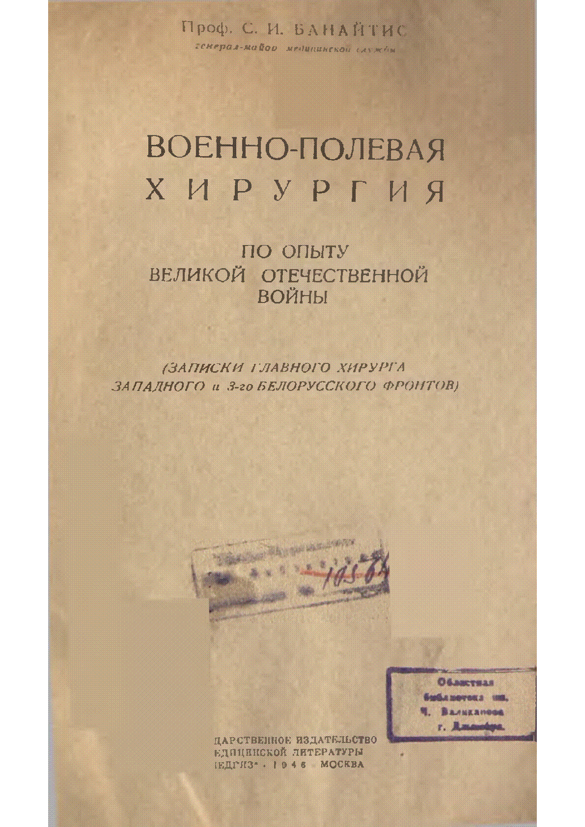 Военно-полевая хирургия [Текст] : по опыту Великой Отечественной войны : (Записки главного хирурга Западного и 3-го Белорусского фронтов) / С. И. Банайтис ... – Москва : Медгиз, 1946. - 143, [1] с., табл.; . . – [б. т.]