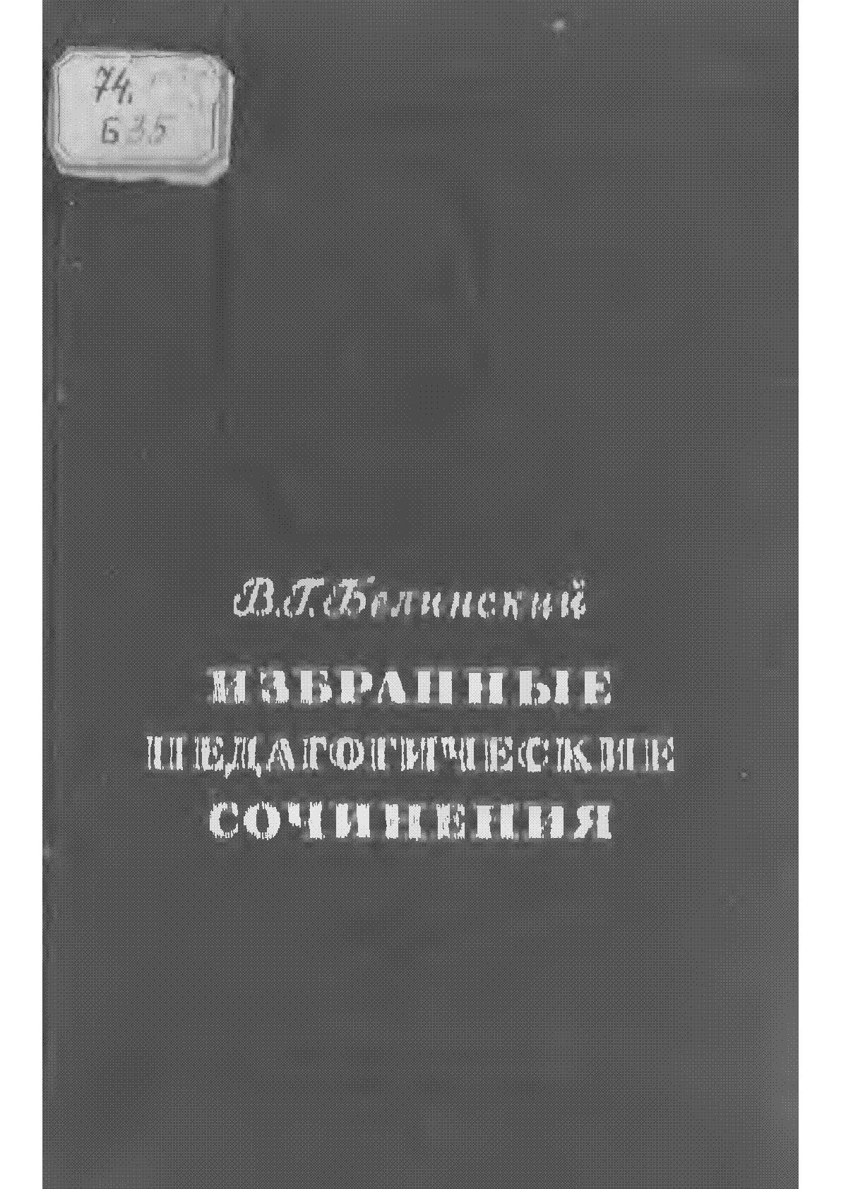 Избранные педагогические сочинения [Текст] / В. Г. Белинский ; [под ред. Е. Н. Медынского] ; Акад. пед. наук РСФСР, Ин-т теории и истории педагогики... – Москва ; Ленинград : Акад. пед. наук РСФСР, 1948. - 280 с., [2] л. портр.; . – Библиогр. в подстроч. примеч. . – 5000 экз.