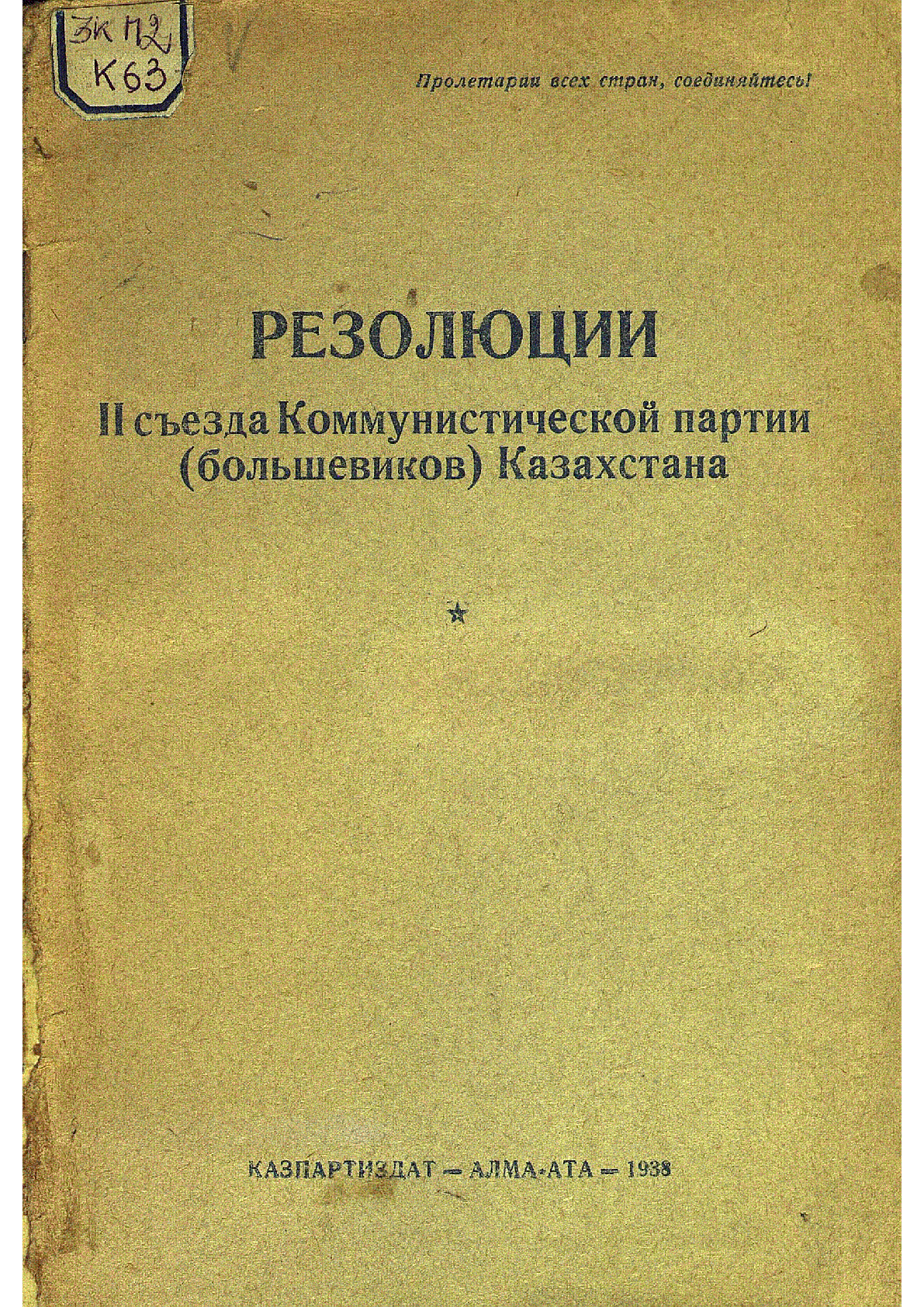 Резолюции ІІ-го съезда Коммунистической партии (большевиков) Казахстана [Текст] / ... – Алма-Ата : Казпартиздат, 1938. - 36 с. . . – 35160 экз.