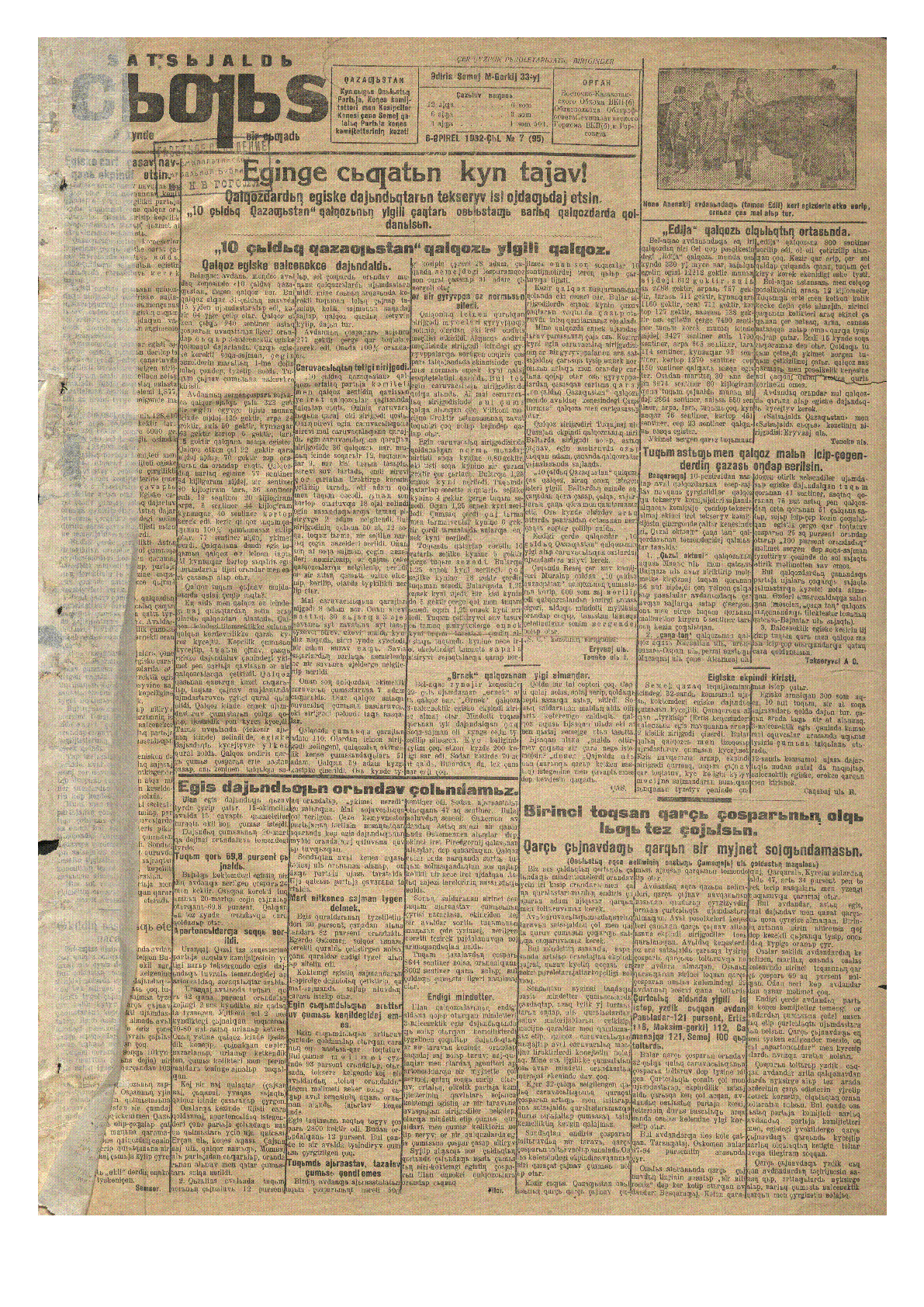 Социалды шығыс 1932, 6 апрель = Satsьjaldь сьgьs [Мәтін] ; ред. М. Нуралиев. – Семипалатинск : Тип. "Прииртышской Правды", 1932. - – Күнара шығады, (Құжатты көшіріп алып оқуыңызды сұраймыз). 1932. - № 7 (95). - 6 апрель.