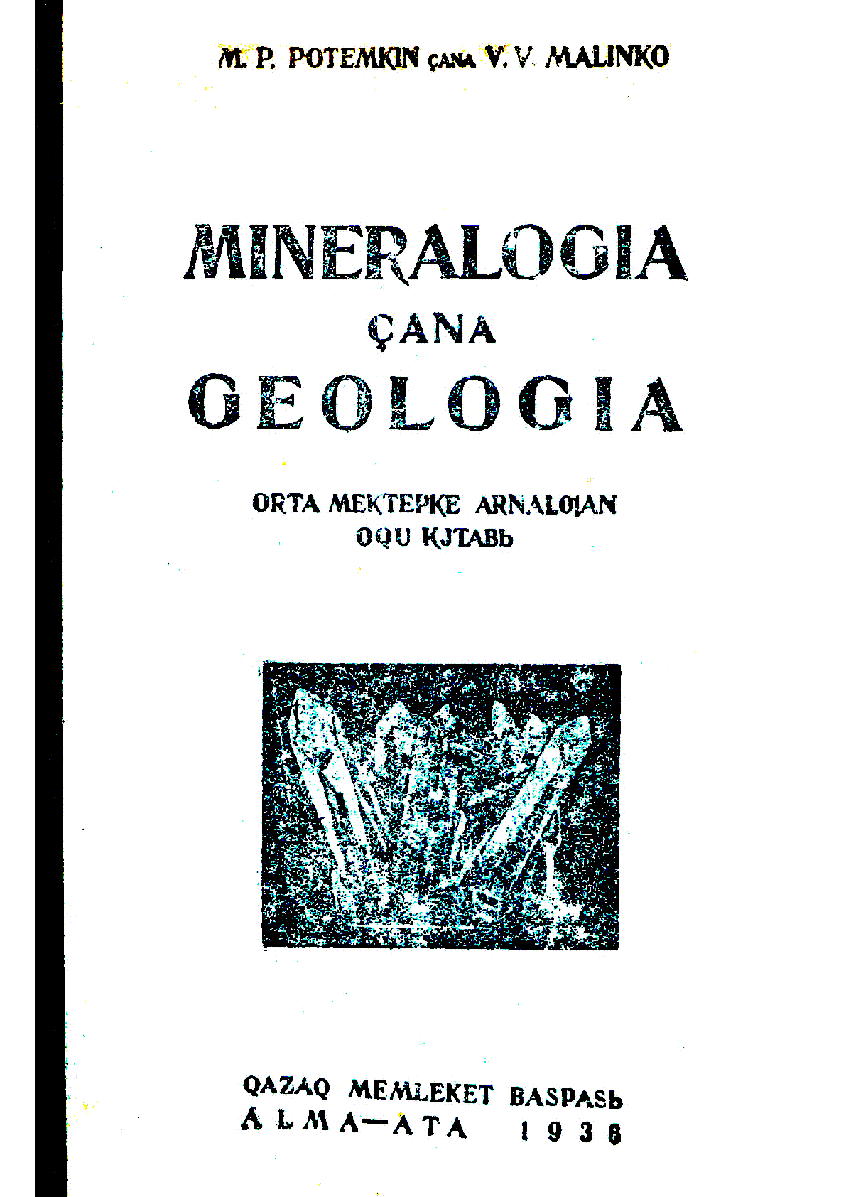 Минералогия және геология [Мәтін] : орта мектептің 10-класы үшін оқу кітабы / М. П. Потемкин В. В. Малинко ; орыс. ред. басқ. А. А. Чернов ; жауапты ред.: Қ. Мырзалиев, А. Масанов ; Қазақстан Оқу Халық Комиссариаты. – 2-бас. .. – Алма-Ата : Қазақ мемлекет баспасы, 1938. - 195, [3] б. - Мәтін латын қарпімен қазақ тілінде . . – [т. ж.] (мұқ.) : 40 тг.