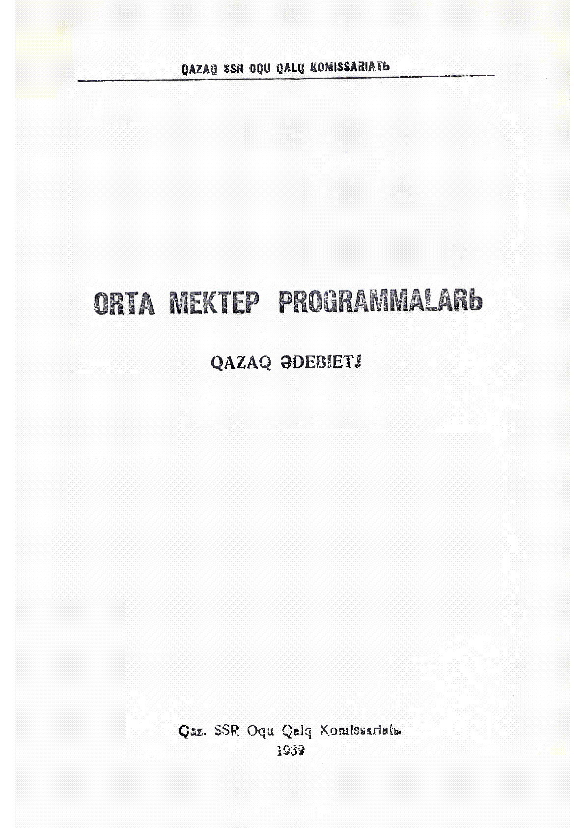 Орта мектеп программалары [Мәтін] : әдебиеттік оқу (Ү-ҮІІ кластар) : әдебиет (ҮІІ-Х кластар) / ; жасағандар: С. Кәрібаев, А. Көсембаев ; Қаз. ССР Оқу Халық Комиссариаты... – Алма-Ата : Қаз. ССР Оқу Халық Комиссариаты, 1939. - 54, [3] б. - Мәтін латын қарпімен қазақ тілінде . . – [т. ж.] : 30 тг.