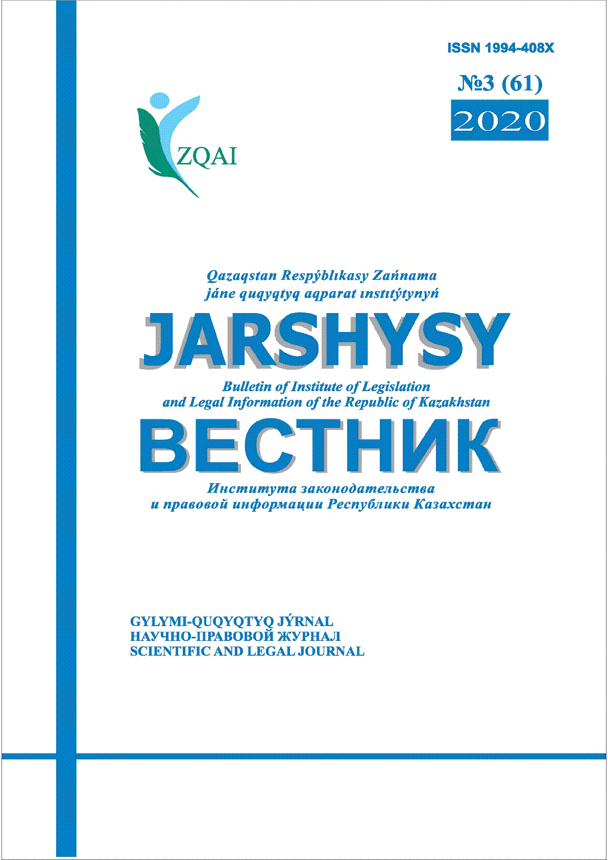 Қазақстан Республикасы Заңнама және құқықтық ақпарат институтының Жаршысы = Вестник института законодательства и правовой информации Республики Казахстан = Bulletin of Institute of Legislation and Legal Information of the Republic of Kazakhstan Jarshysy [Мәтін] : ғылыми-құқықтық журнал ; бас ред. Е. А. Дүйсенов ; ҚР Заңнама және құқықтық ақпарат ин-ты. – Астана : "Қазақстан Республикасының (Заңнама) Заң шығару институты" ММ, 2020. - .– [т. ж.].– 1994-408Х. № 3(61), 2020. - [т. ж.]
