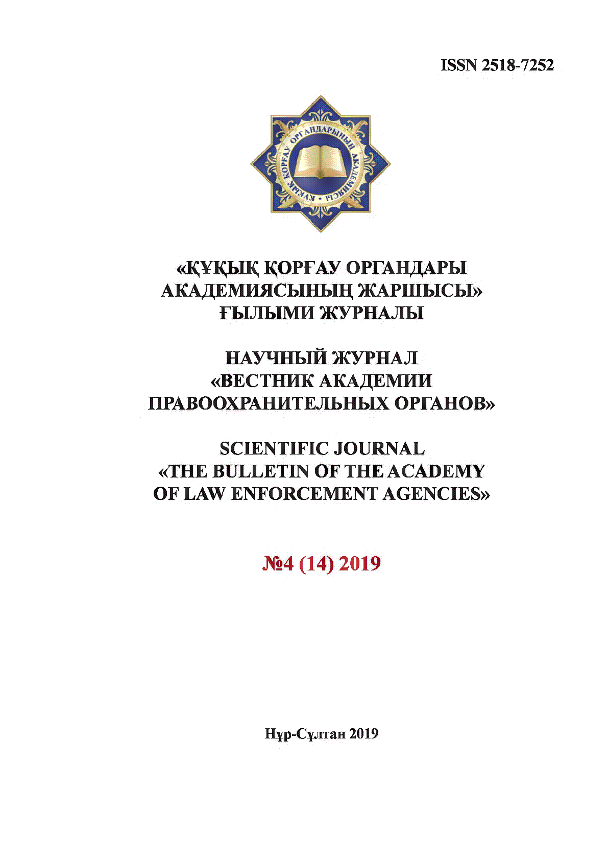 Құқық қорғау органдары академиясының жаршысы = Вестник Академии правоохранительных органов = The Bulletin of Academy of Law Enforcement Agencies [Мәтін] : ғылыми журнал ; [бас ред.: А. Ж. Сыздықов ; Құқық қорғау органдары акад.]. – Нұр-Сұлтан : Құқық қорғау органдары академиясы, 2019. - .– [т. ж.].– Тоқсан сайын шығарылады. – 2518-7252. № 4(14), 2019. - [т. ж.]