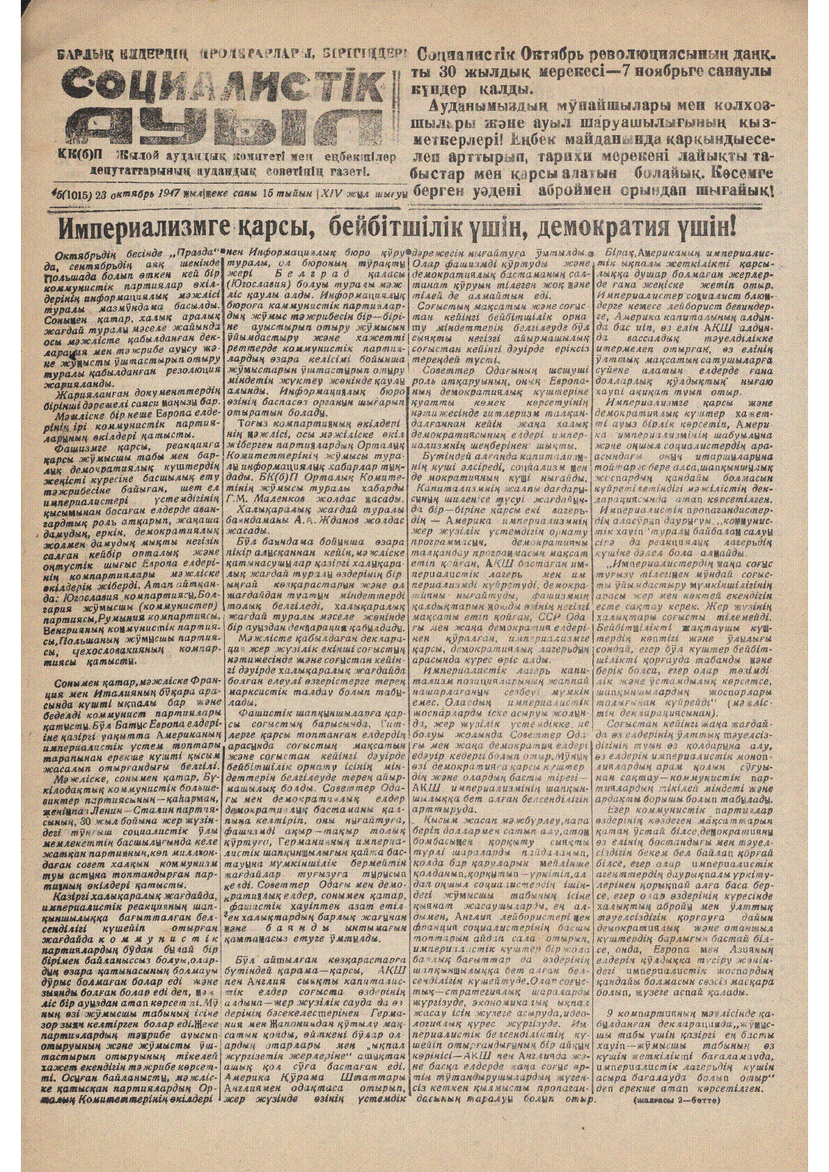 Социалистік ауыл [Мәтін] / Жауапты редактор: С. Ерғалиев. .– 1218 дана. 1947. - 23 октябрь. - №45 (1015). - 1218 дана