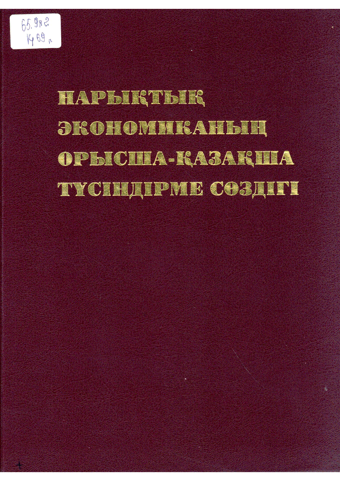 Нарықтық экономиканың орысша-қазақша түсіндірме сөздігі [Мәтін] / А. Қ. Қошанов Е. Ф. Сағымбай Е. М. Арын ; жауапты ред. А. Қ. Қошанов ; ҚР Ғылым және Жоғары Білім министрлігі, ҚР Ұлттық Ғылым Акад-сы... – Алматы : ҚазмемҒАҒЗИ, 2001. - 398, [1] б. - Шора Сарыбаев қоры. - Автор қолтаңбасымен Ш. Сарыбаевқа тартуы . . – 1000 дана – ISBN 99-65-466-51-3 (мұқ.) : 0 тг.