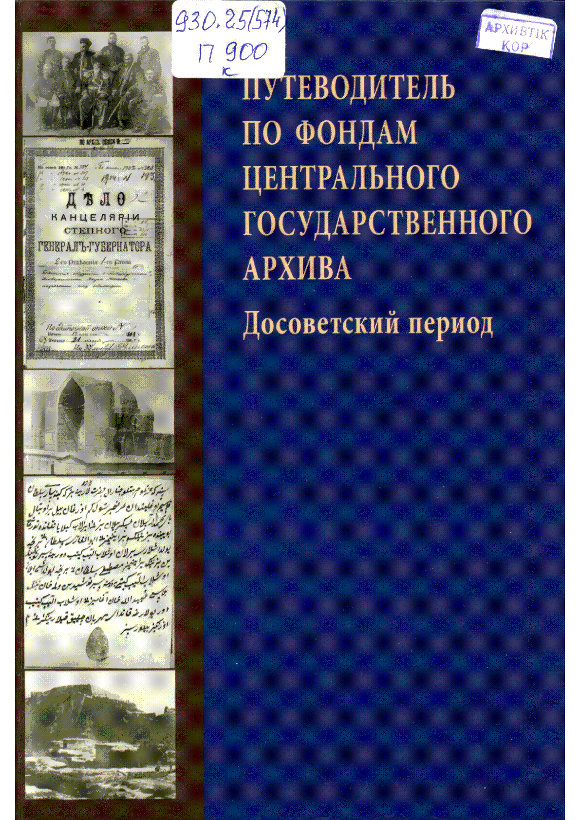 Путеводитель по фондам Центрального государственного архива. Досоветский период [Текст] / ; [редакционная коллегия: К. К. Бораш [и др.] ; составитель и предисловие И. М. Самигулин] ; РГУ "Центральный государственный архив" ; Комитет по делам архивов и управления документации ; Министерство культуры и спорта РК ... – Алматы : [б. и.], 2021. - 394 с. 21 см - Посвящается 100-летию Центрального государственного архива Республики Казахстан . . – 500 экз. – ISBN 978-601-7333-36-2 (в пер.) : 2870 тг.