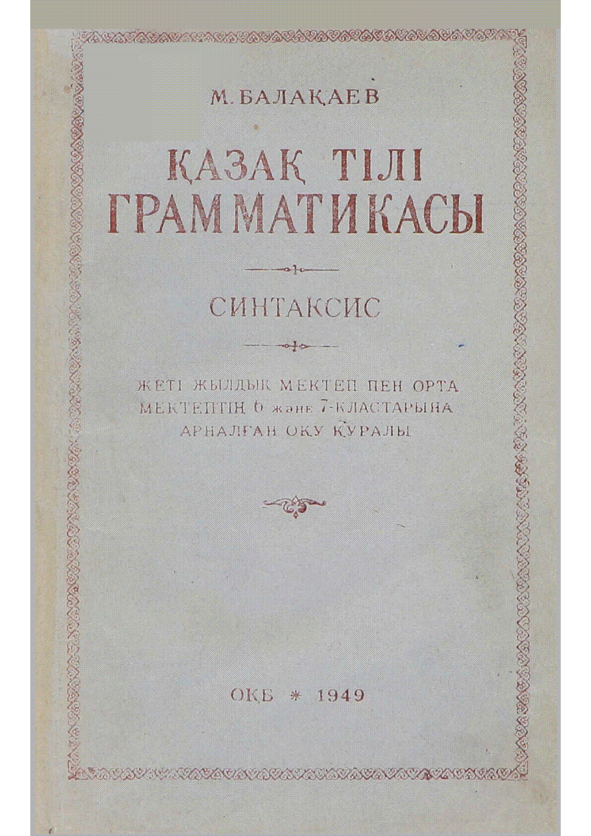 Қазақ тілінің грамматикасы [Мәтін] : жеті жылдық және орта мектептердің 6, 7 кластарына арналған / М. Балақаев – 1-бас. ,- Алматы : Қазақтың мемлекеттік оқу құралдар баспасы , 1949.– 30000 дана . - Мұқ. атауы: Қазақ тілі грамматикасы. - Шора Сарыбаев қоры . 2-бөлім . Синтаксис– 179, [1] б. : 0 тг.