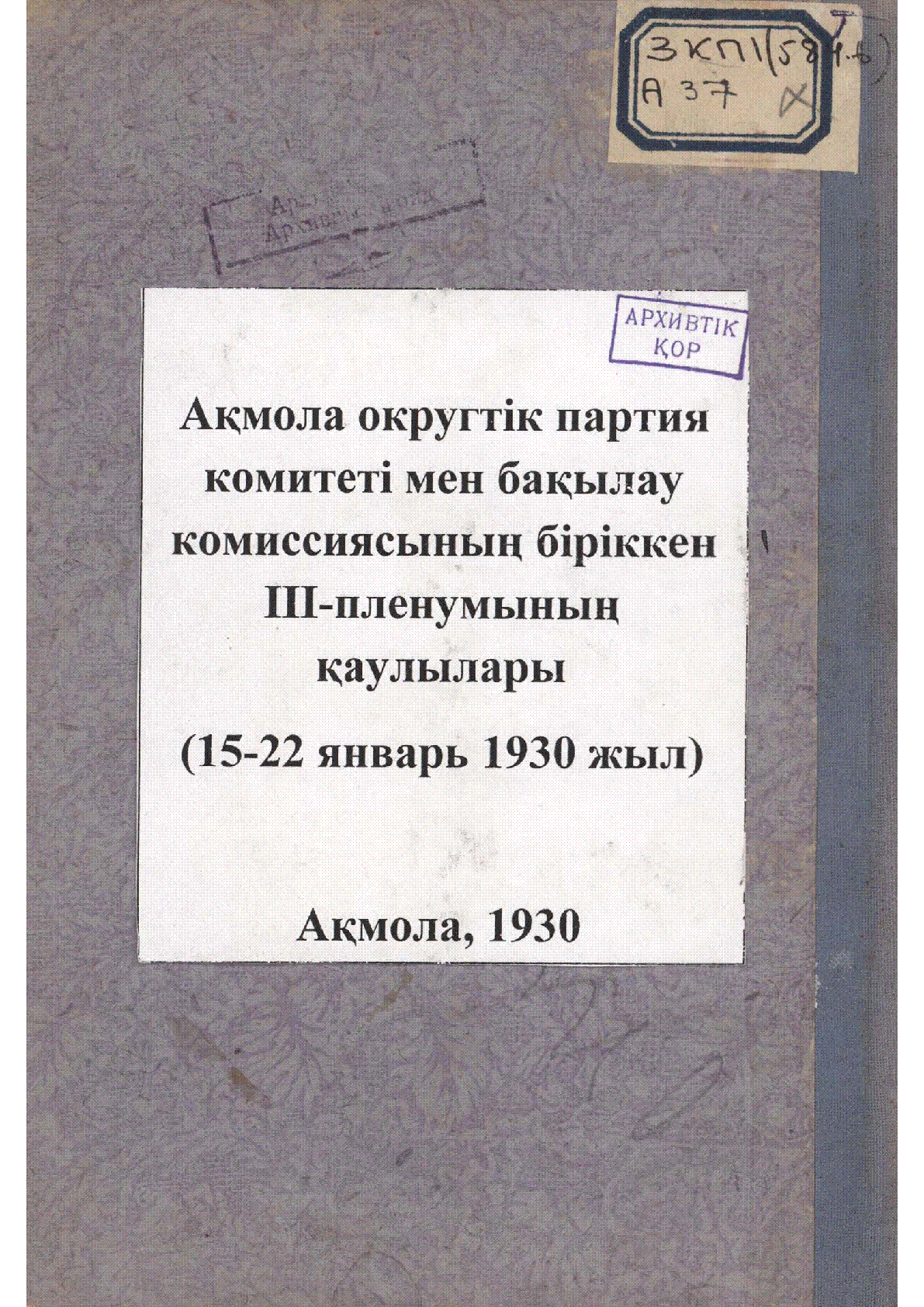 Ақмола округтік партия комитеті мен бақылау комиссиясының біріккен ІІІ-пленумының қаулылары = اقمولا وكىرىكتىك پارتىيا كامىيتەتى مەن باقىلاۋ كامەسىيەسىنىڭ بىرىككەن 3 پىلەنۇمىنىڭ قاۋلىلارى [Мәтін] : (15-22 январь 1930 жыл) / ... – Ақмола : Тип. "Спутник революции", 1930. - 43 б.– (Ақмоланың округтік партия комитеті. - Мәтін араб графикасымен жазылған. . . : 800 дана