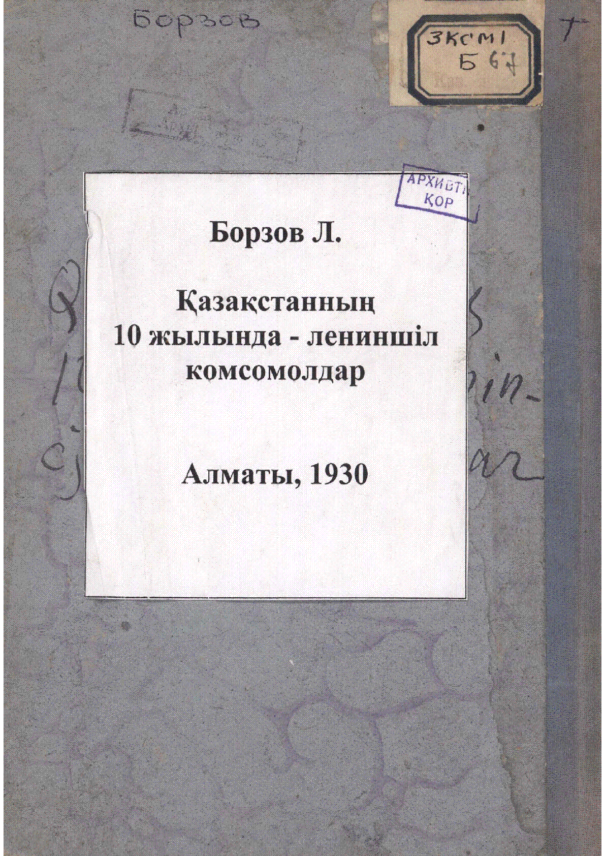 Қазақстанның 10 жылында лениншіл комсомолдар [Мәтін] / Борзов Л. ... – Алматы : Қазақстан 10 жылдық тойын өткізуші комиссия баспасы, 1930. - 46 бет– (Автономиялы Қазақ Республикасының 10 жылдығына. - Араб графикасы. . . – 10000 дана