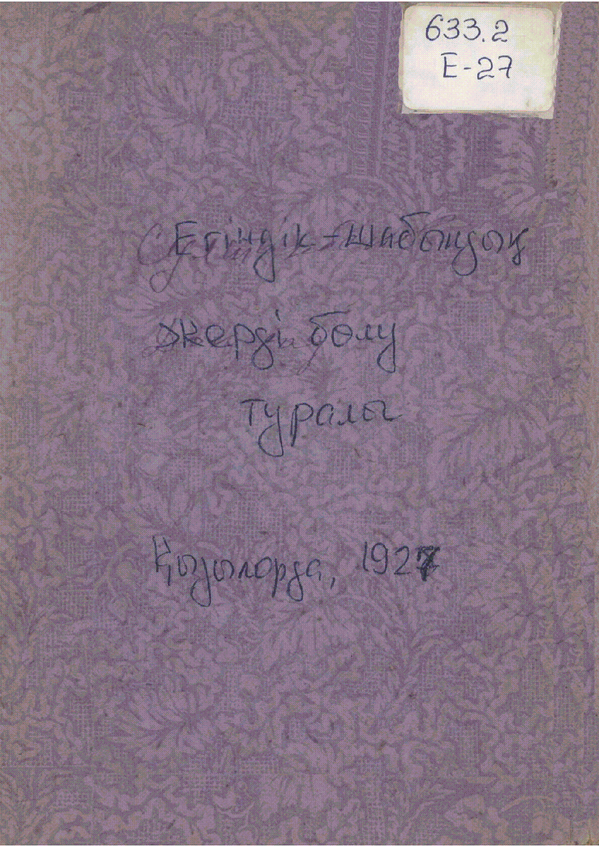 Егіндік-шабындық жерді бөлу туралы [Мәтін] : Жағыпардың (Сұлтанбеков) баяндамасы мен Ғаббастың (Тоғжанов) кедейлермен әңгімесі / ... – Қызылорда : Қазақстан мемлекет баспасы, 1927. - 84 б. 16,5х12 см. – (Қазақстан жер-су комиссариаты. , – ("Еңбекші қазақ" кітапханасы №13. - Мәтін араб графикасымен жазылған . . – 8000 дана : 15 т.