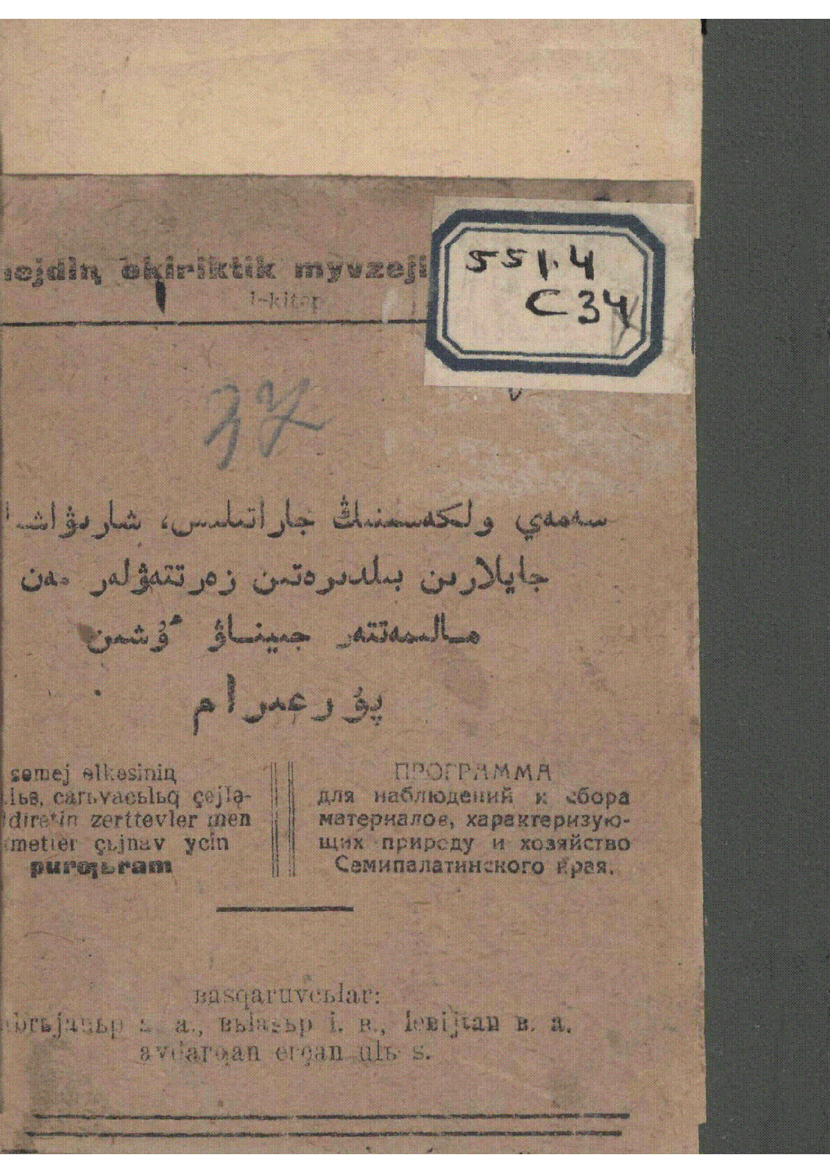 Семей өлкесінің жаратылыс, шаруашылық жайларын білдіретін зерттеулер мен мәліметтер жинау үшін программа = سەمەي ولكەسىنىڭ جاراتىلىس، شارىۋاشىلىق جايلارىن بىلدىرەتىن زەرتتەۋلەر مەن مالىمەتتەر جىيناۋ ءۇشىن پۇرعىرام [Мәтін] / ... – Семей : Округтік баспасы, 1930. - 128 б. 15х11,5 см – (Семейдің округтік музейінің еңбегі 1-кітап. - Мәтін араб графикасымен жазылған . . – 1000 дана : 45 т.