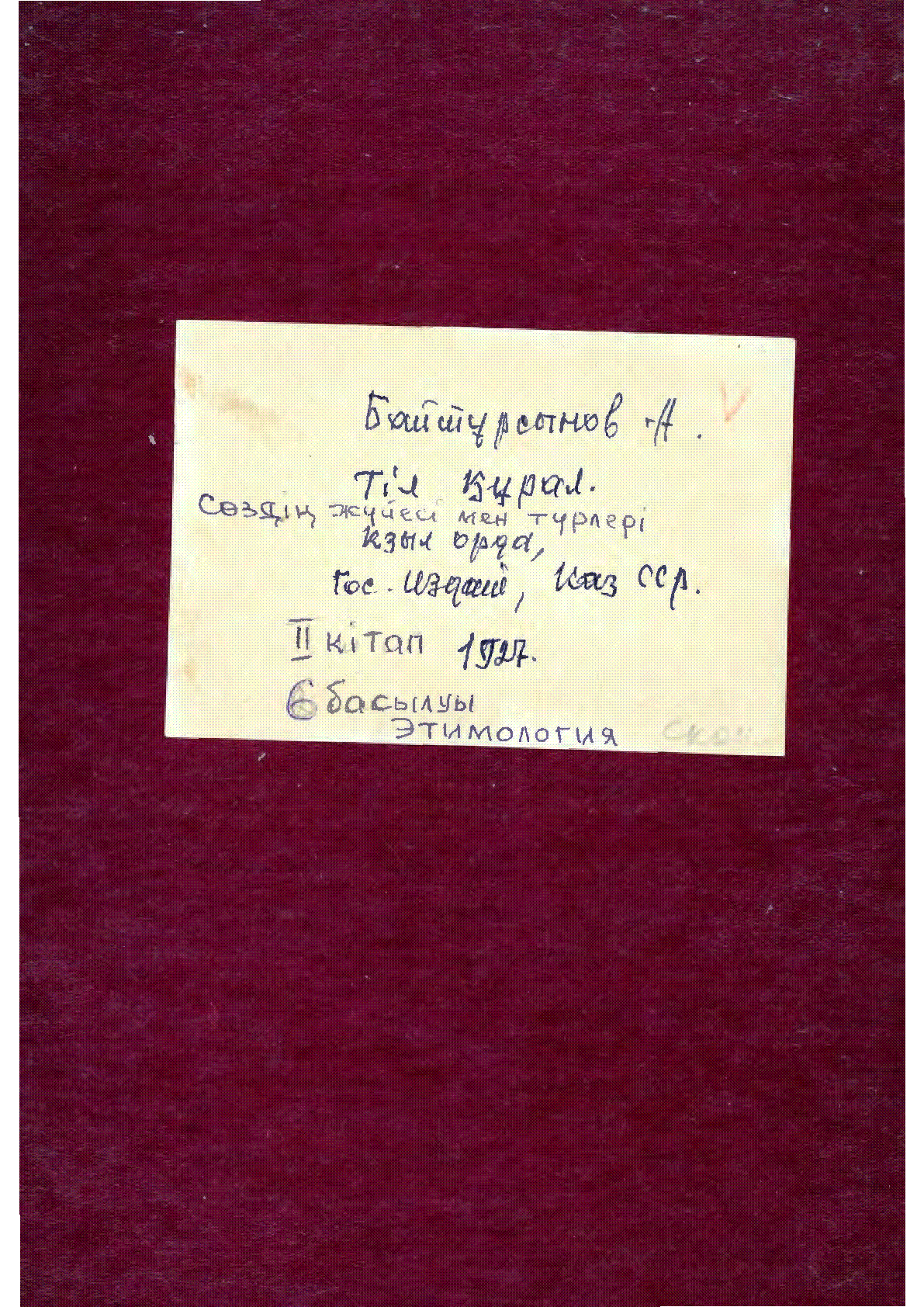 Тіл құрал = ءتىل قورال [Мәтін] : сөздің жүйесі мен түрлері. 2-інші тіл танытқыш кітап / А. Байтұрсынов . – 6- бас. .. – Қызылорда : Қазақ мемлекет баспасы, 1927. - 122 б. 26х18 см – (Қазақстан халық ағарту комиссариятының білім-әдіс кеңесі. - Мәтін араб графикасымен жазылған . . – 15000 дана