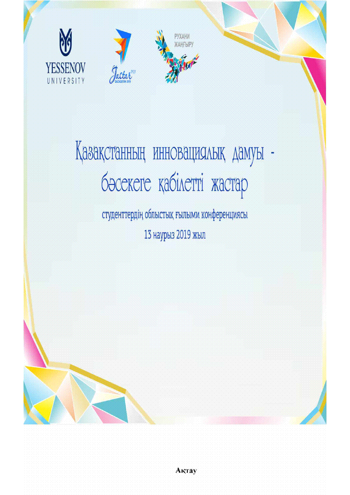 "Қазақстанның инновациялық дамуы - бәсекеге қабілетті жастар" = «Инновационному развитию Казахстана - конкурентоспособная молодежь» = "Innovative development of Kazakhstan - competitive youth» [Мәтін] : студенттердің облыстық ғылыми конференциясының материалдары : 13 наурыз, 2019 / ; Ш. Есенов атындағы Каспий мемлекеттік технологиялар және инжиниринг университеті, жалпы редакциясын басқарған Б. Б. Ахметов, редакциялық алқа: Е. Т. Нұрмағанбет, Ш. К. Джумагазиева, Г. Ж. Булекбаева, Б. Б. Атшыбаева, А. З. Букаева, А. М. Джанисенова... – Ақтау : Ш. Есенов атындағы КМТжИУ, 2019. - 200 б., суретті; - Мәтін қазақ, орыс тілд. . – Библиогр. мақала соңында . – 50 дана – ISBN 978-601-308-150-2