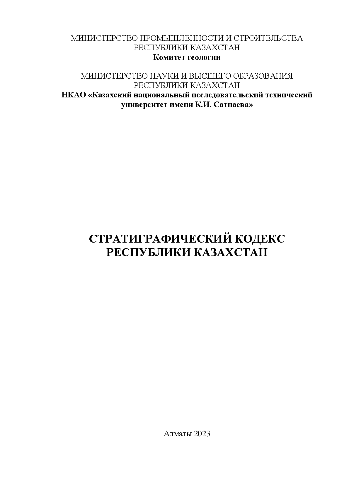 Стратиграфический кодекс Республики Казахстан [Текст] / ; Министерство промышленности и строительства Республики Казахстан, Комитет геологии ; Министерство науки и высшего образования Республики Казахстан ; Казахский национальный исследовательский технический университет имени К. И. Сатпаева ; Институт геологических наук имени К. И. Сатпаева ; [главный редактор Е. Е. Акбаров ; редакционная коллегия: А. Н. Коротков [и др.] ; составители: А. Б. Байбатша [и др.]]... – Алматы : [б. и.], 2023. - 137 с., ил.; - Посвящается 125-летию академика К. И. Сатпаева . – Библиогр.: с. 115-117 . – 100 экз. – ISBN 978-601-323-430-4 : 0 тг.