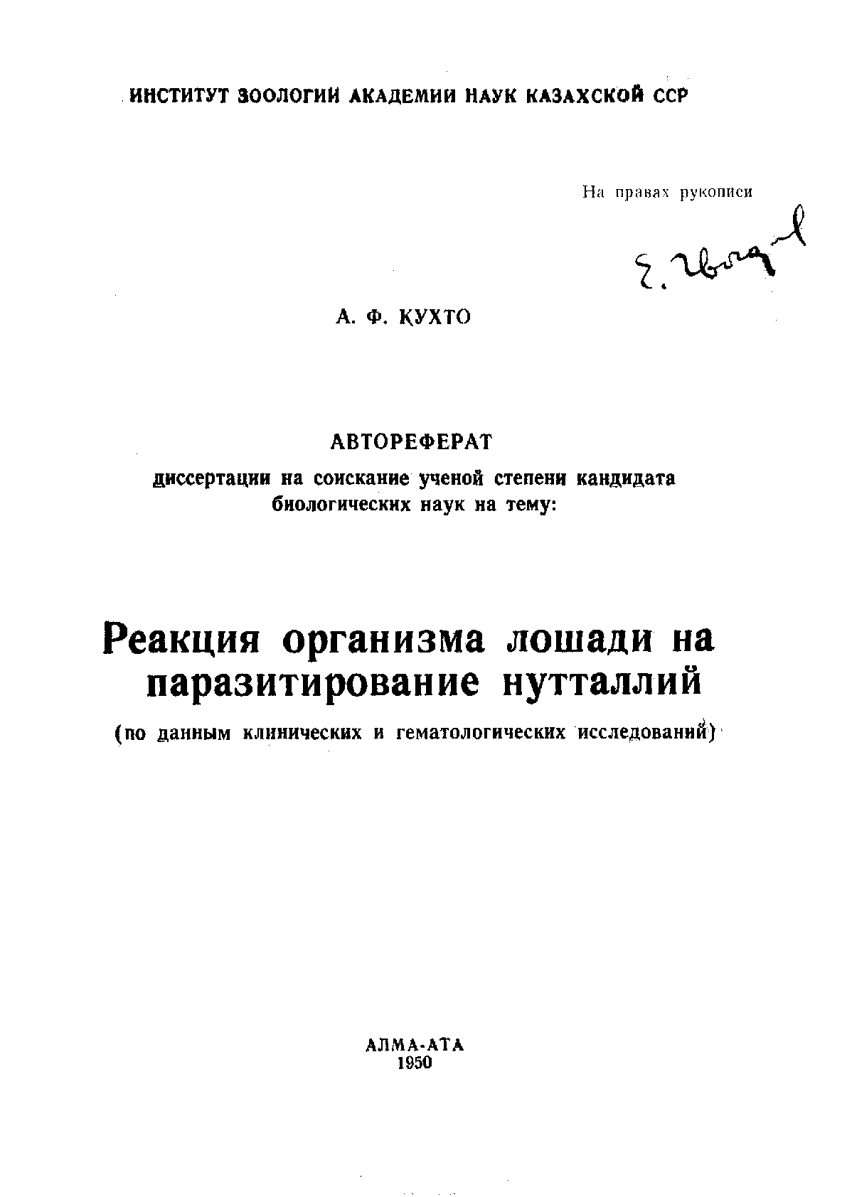 Реакция организма лошади на паразитирование нутталлий (по данным клинических и гематологических исследований) [Текст] : Автореферат диссертации на соискание ученой степени кандидата биологических наук / А. Ф. Кухто ; Институт Зоологии Академии наук Казахской ССР... – Алма-Ата [Алматы] : Издательство Академии наук Казахской ССР, 1950. - 13, [1] с. . . – [б. т.]