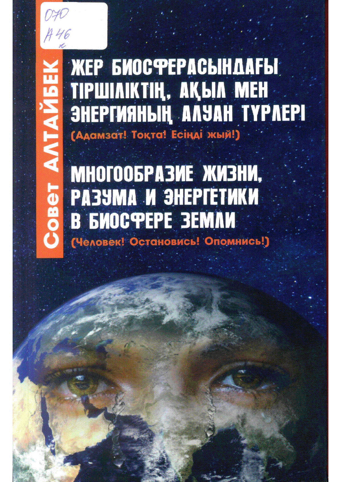 Жер биосферасындағы тіршіліктің, ақыл мен энергияның алуан түрлері (Адамзат! Тоқта! Есіңді жый!) = Многообразие жизни, разума и энергетики в биосфере земли (Человек! Остановись! Опомнись!) [Мәтін] / С. Алтайбек ... – Алматы : Балауса, 2023. - 328 бет 20,5 см - мәтін қазақ, орыс тілдерінде . . – 100 дана – ISBN 978-601-81037-2-8