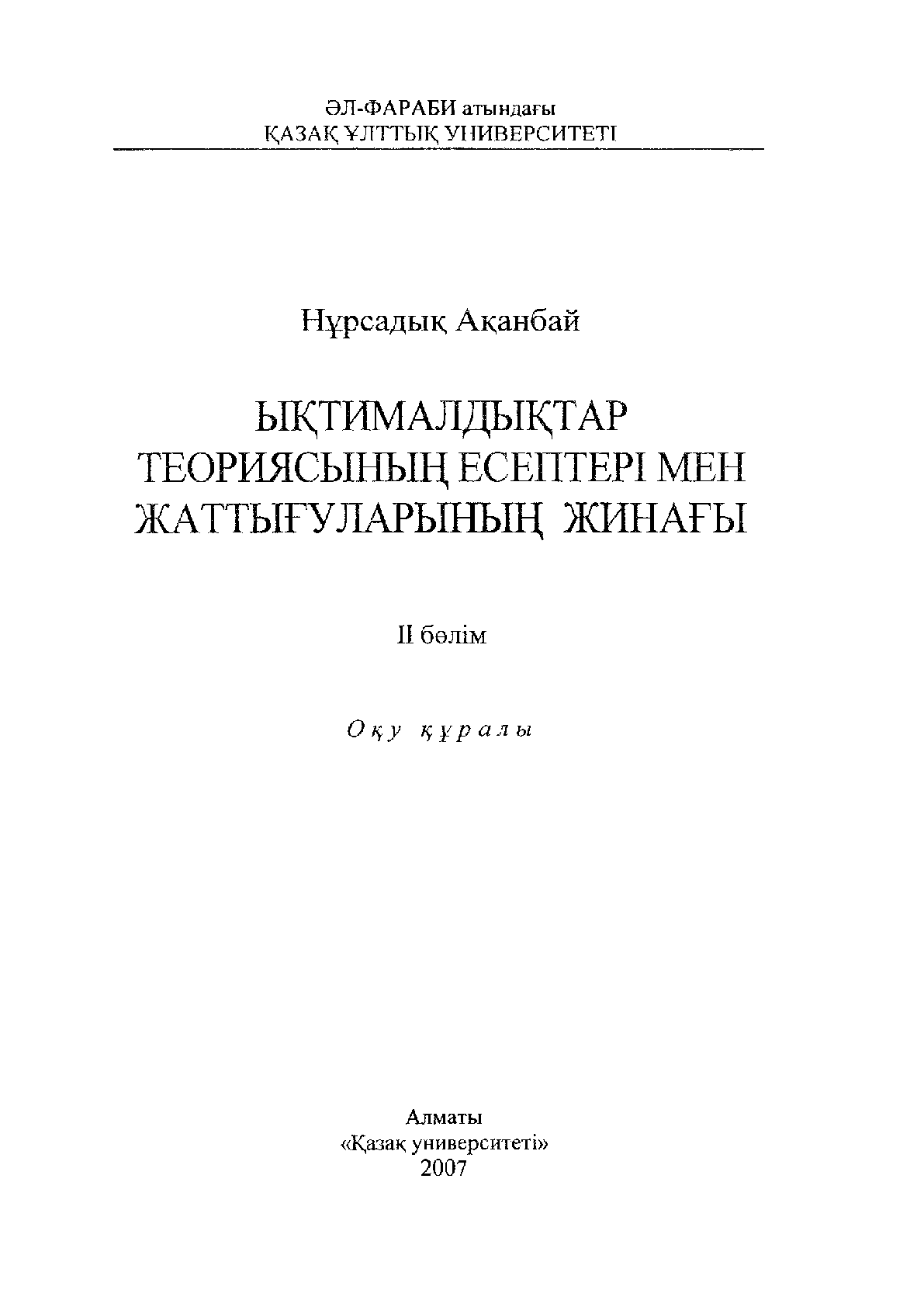 Ықтималдықтар теориясың есептері мен жаттығуларының жинағы [Мәтін] : оқу құралы / Н. Ақанбай- Алматы : "Қазақ университеті" , 2007.– 1000 дана . – ISBN 9965-30-425-4 Библиогр.: 330-331 б. 2-бөлім . Әл-Фараби атындағы Қазақ ұлттық университеті ; [редактор А. Шуриева]– 330, [1] б.