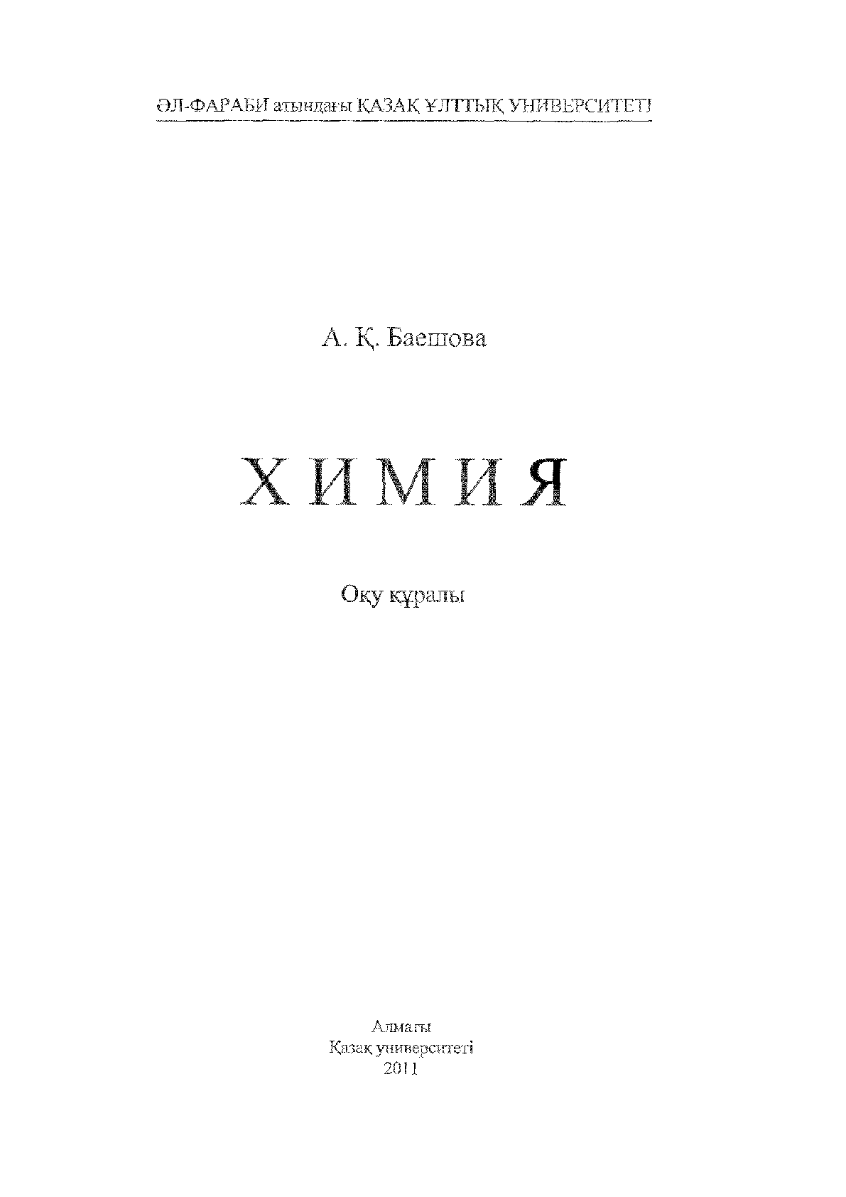 Химия [Мәтін] : оқу құралы / А. Баешова ; Әл-Фараби атындағы Қазақ ұлттық университеті... – Алматы : Қазақ университеті, 2011. - 103, [1] б. . – Әдебиеттер: 102 б. . – 100 дана – ISBN 9965-29-726-6