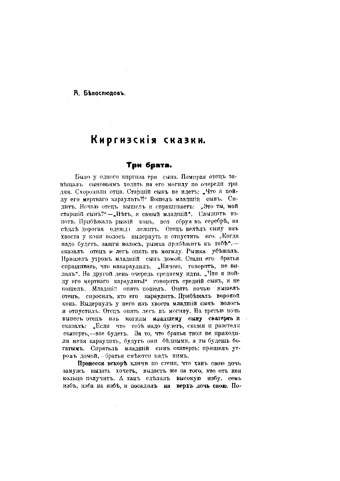 Три брата [Текст] : киргизские сказки / А. Н. Белослюдов ; [записанны со слов Н. Тарабаева]... – Омск : [б. и.], 1916. - с. 23–31– (Записки Западно-Сибирского отдела Императорского русского географического общества. ; Книга 38- Содержание: Три брата ; Девять глупых и один умный ; Алдар-Госе ; Джеренше / А. Н. . Белослюдов . . – [б. т.]