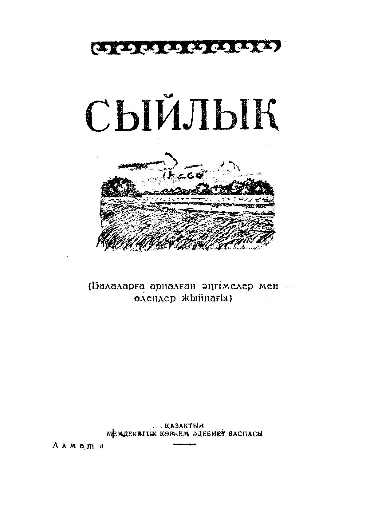 Сыйлық [Мәтін] : (балаларға арналған әңгімелер мен өлеңдер жыйнағы) / ; құрастырған М. Нұртазин... – Алматы : Қазақтың мемлекеттік көркем әдебиет баспасы, 1950. - 117, [3] б. . . – 15000 дана