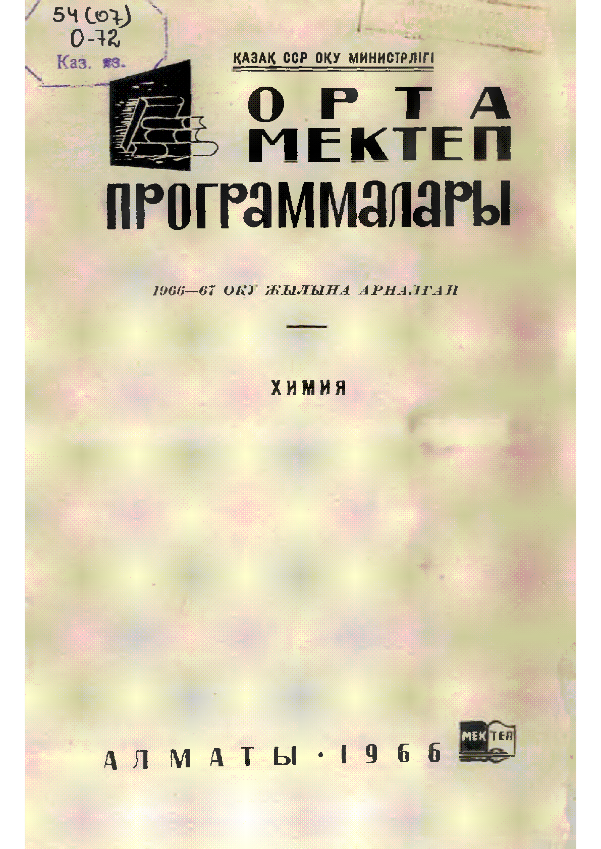 Орта мектеп программалары. Химия [Мәтін] : 1966-67 оқу жылына арналған / ; Қазақ ССР оқу министрлігі ; [редакторы М. Сатекова]... – Алматы : Мектеп, 1966. - 22, [1] б. . . – 3500 дана