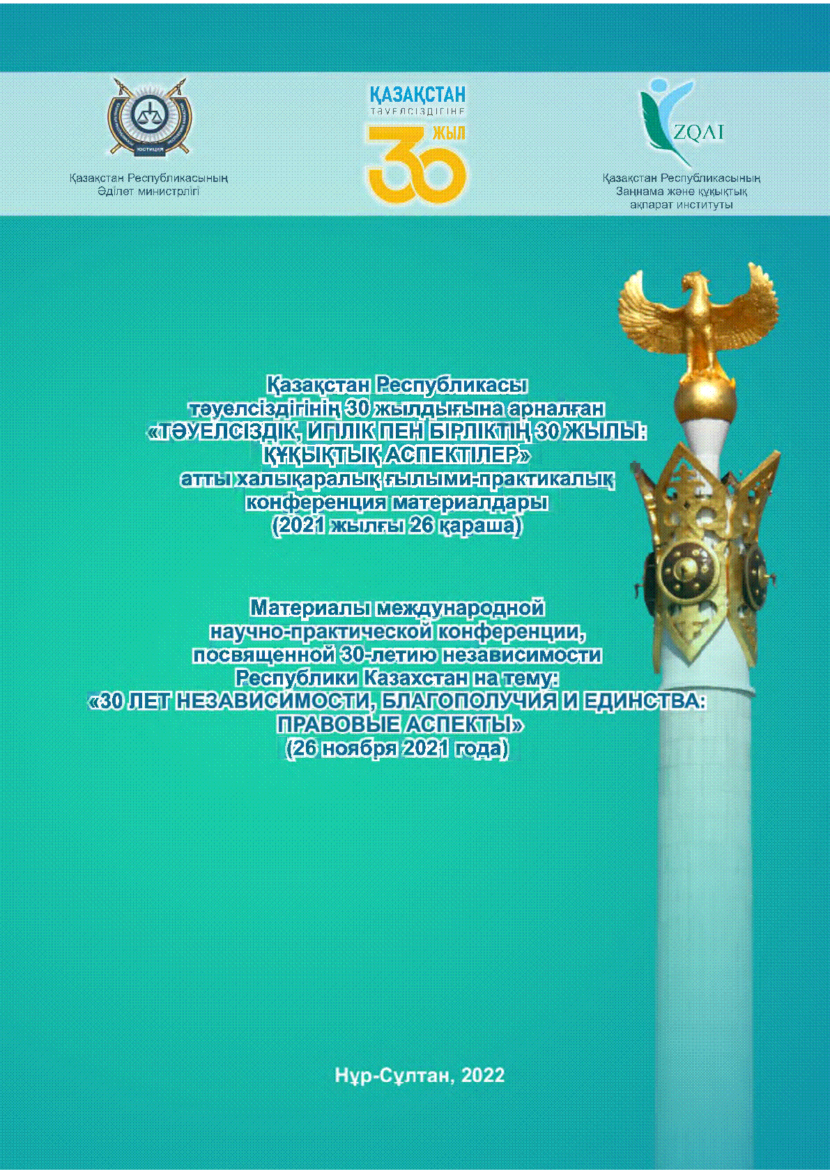 30 лет независимости, благополучия и единства: правовые аспекты = Тәуелсіздік, игілік пен бірліктің 30 жылы: құқықтық аспектілер [Текст] : материалы международной научно-практической конференции (26 ноября 2021 года), посвященной 30-летию независимости Республики Казахстан / ; Министерство юстиции Республики Казахстан ; Институт законодательства и правовой информации Республики Казахстан ; [редакционная коллегия: Р. К. Сарпеков [и др.]]... – Нур-Султан [Астана] : Институт законодательства и правовой информации Республики Казахстан, 2022. - 342 с. - Текст рус., каз. . – Список использованных источников в конце статей . – [б. т.] – ISBN 978-601-7366-81-0