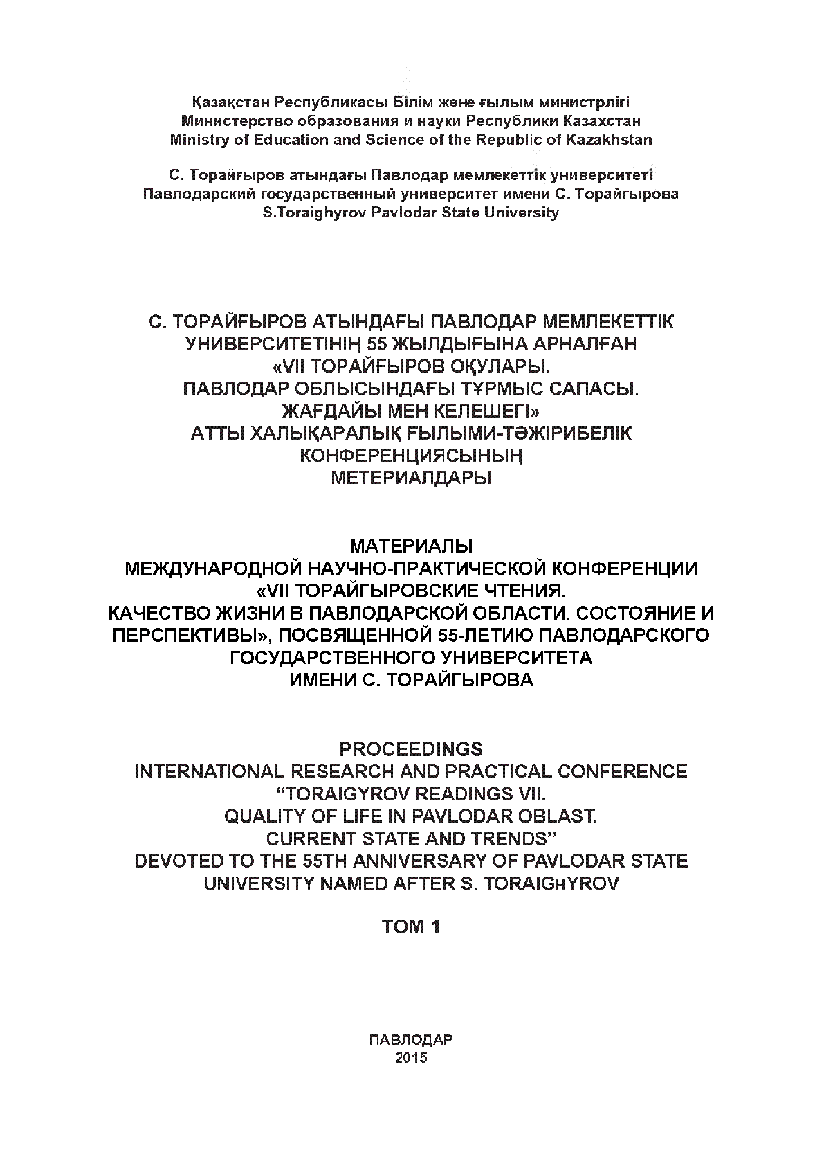 "VII Торайғыров оқулары. Павлодар облысындағы тұрмыс сапасы. Жағдайы мен келешегі" [Мәтін] : С. Торайғыров атындағы Павлодар мемлекеттік университетінің 55 жылдығына арналған : халықаралық ғылыми-тәжірибелік конференциясының материалдары ; Қазақстан Республикасы Білім және ғылым министрлігі, С. Торайғыров атындағы Павлодар мемлекеттік университеті ; [редакция алқасының бас редакторы: А. А. Өрсариев ; жауапты редактор: Н. Т. Ержанов ; редакция алқа мүшелері: А. А. Акишев [т. б.]] .- Павлодар : [б. ж.] , 2015.– 500 дана . – ISBN 978-601-238-547-2(ортақ), ISBN 978-601-238-548-9(1-том) - Мәтін қазақ, орыс, ағылшын тілдерінде . Әдебиеттер тізімі мақала соңында 1-том .– 427 б.