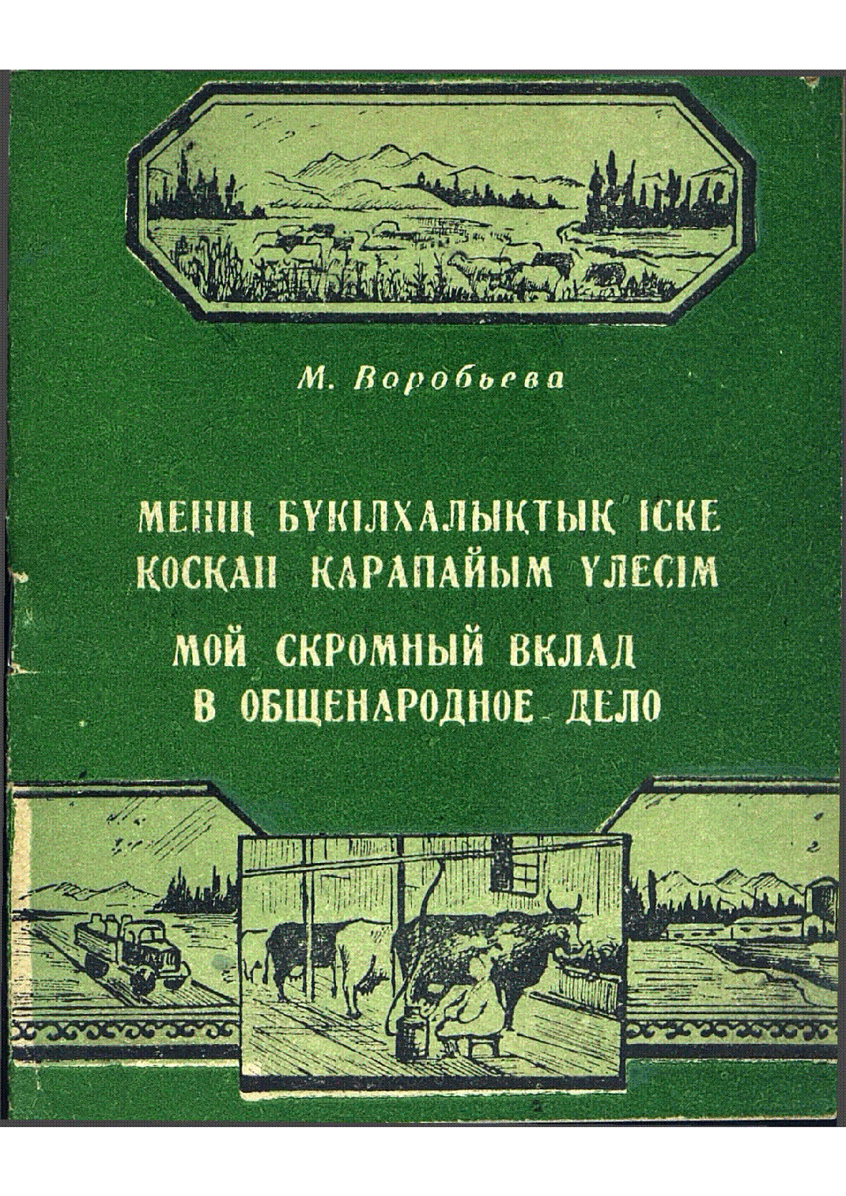 Менің бүкілхалықтық іске қосқан қарапайым үлесім [Мәтін] : Мой скромный вклад в общенародное дело / М. Воробьева ; Қазақстан Коммунистік партиясы, Талдықорған обкомының үгіт және насихат бөлімі ; [шығарылымға жауапты: Д. Е. Марченко] .- Талдықорған : [б. ж.] , 1958. – Озат тәжірибе туралы сауыншының кітапханасы. = Библиотечка доярки о передовом опыте.– 500 дана . - Мәтін қазақ және орыс тілдерінде . 1-том .– 17 б., порт. .