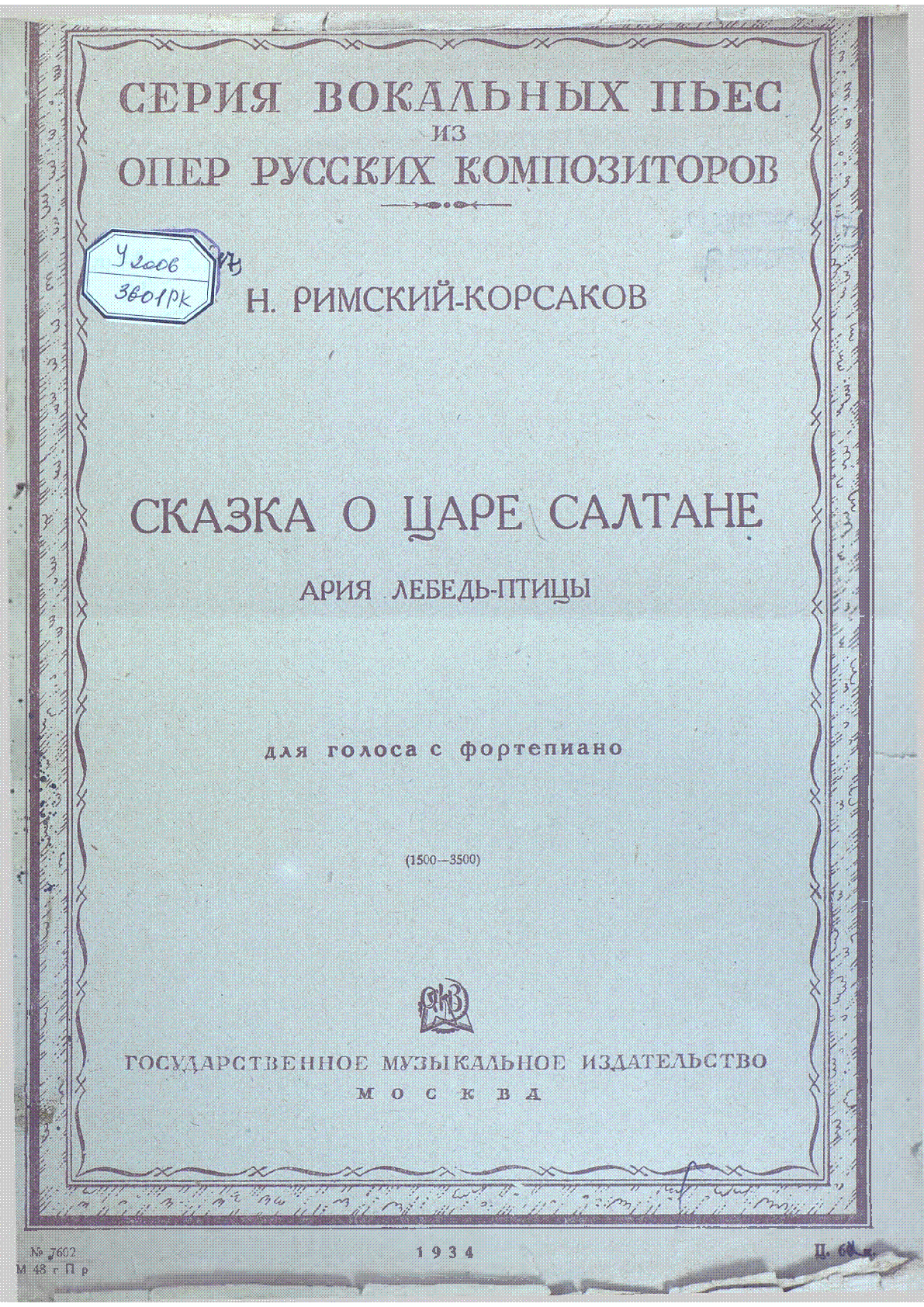 Сказка о царе Салтане [Ноты] [Ноты] : ария Лебедь-птицы : для голоса с фортепиано / Н. А. Римский-Корсаков ; [ред. И. Шишов]... – Москва : Музгиз, 1934. - 5 с., ноты;– (Серия вокальных пьес из опер русских композиторов. . . – 2000 экз.