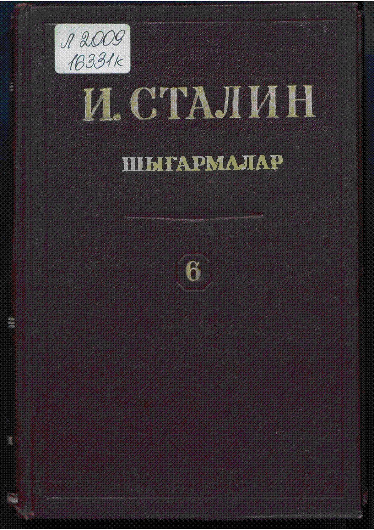 Шығармалар [Мәтін] Сталин, Иосиф Виссарионович ; Маркс - Энгельс - Ленин институтының қазақ филиалы- Алматы : Қазбір мем. бас. , 1949. – Барлық елдердің пролетарлары, бірігіңдер!.– 50 000 дана . – көрсетілмеген (мұқ.) Т. 6 . 1924– 483 б. : 500 тг.
