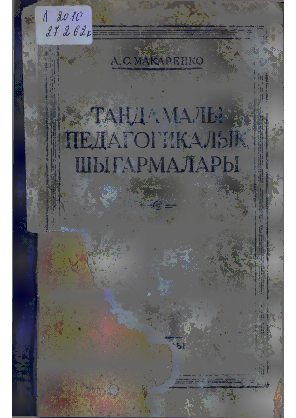 Таңдамалы педагогикалық шығармалары [Мәтін] / Макаренко, Антон Семенович ... – Алматы : Қаз. мем. оқу құралдар баспасы, 1948. - 208 б. . . – 10 000 дана – көрсетілмеген (мұқ.) : 267 тг.