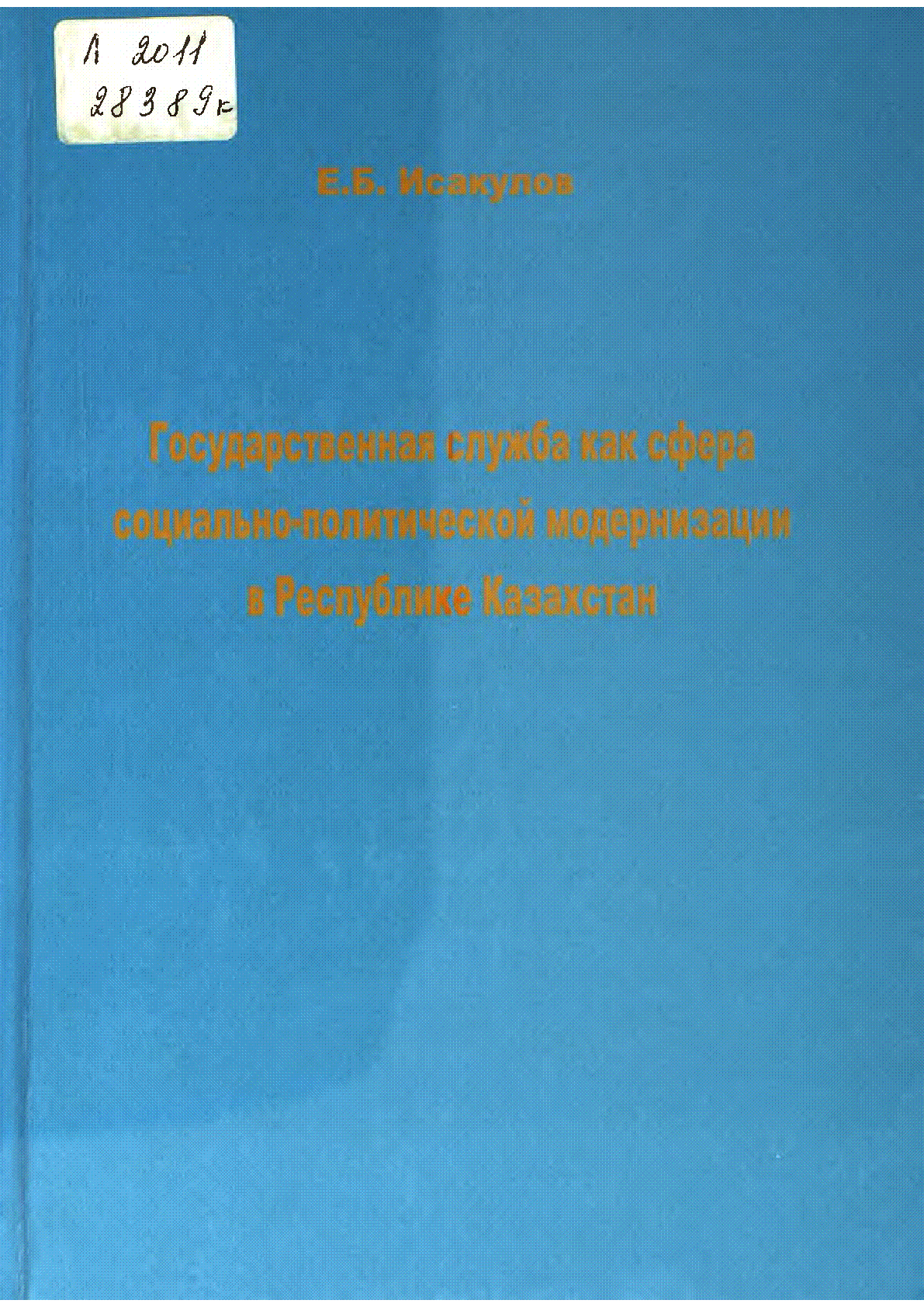 Государственная служба как сфера социально-политической модернизации в Республике Казахстан: политологический анализ [Текст] : монография / Исакулов, Ержан Бекбауович ... – Астана : [Б. ж.], 2008. - 259, [1] с., табл.; . – Библиогр.: с. 250-259 . – 300 экз. – 978-601-06-0073-7 : 350 тг.
