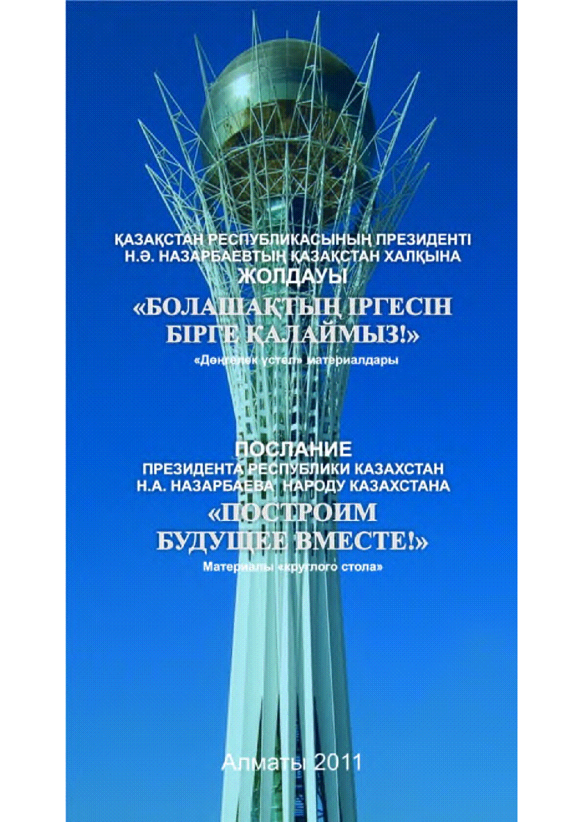 Послание Президента Республики Казахстан Н. А. Назарбаева народу Казахстана "Построим будущее вместе!" [Текст] : Материалы "круглого стола" (8 февр. 2011 г., г. Алматы) / ; Казахстанский институт стратегических исследований при Президенте Республики Казахстан... – Алматы : [б. и.], 2011. - 133, [1] с. . – Библиогр.: с.34, 113-114, 121 . – 500 экз. – ISBN 978-601-7242-30-5 (в пер.) : 600 тг.