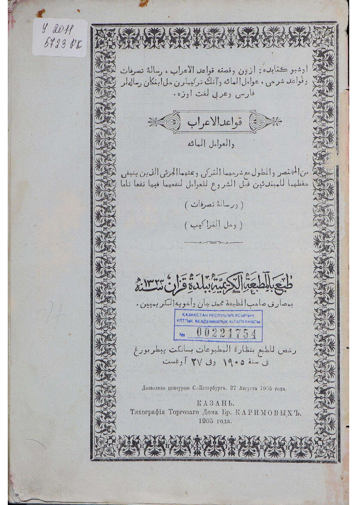 Рисалят тасарруфат [Text] / ... – Казань : Типография торгового дома Братья Каримовых, 1905. - 156 с. - Мәтіні араб., парсы, және татар тілд., Мазм.: Қауаид аль-иъраб. / Рисалят тасарруфат. /Аль-ауамиль аль-миъа. /Халь ат-таракиб . . – [т. ж.] – көрсетілмеген : 10 000 тг.