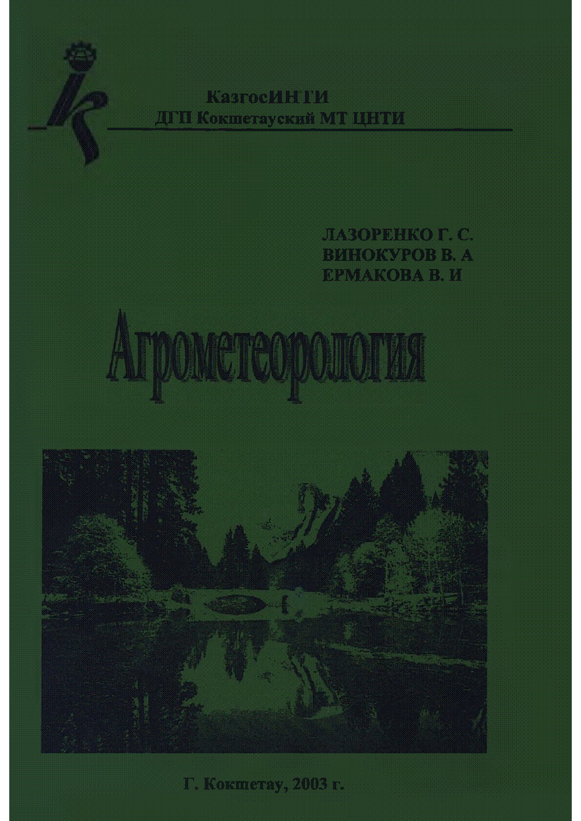 Агрометеорология [Текст] : учебное пособие / Г. С. Лазоренко В. И. Ермакова, В. А. Винокуров ; М-во образования и науки РК, КазгосИНТИ, ДГП Кокшетау. МТ ЦНТИ... – Кокшетау : [б. т.], 2002. - 96 с. . – Библиогр.: с. 95 . – 50 экз. – ISBN 9965-678-17-0 : 70 тг.