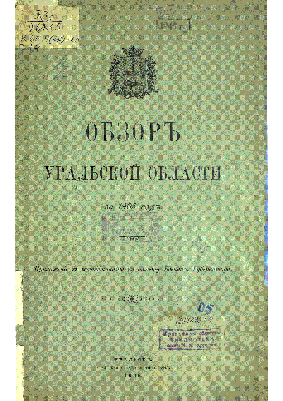 Обзор Уральской области за 1905 год [Текст] : Приложение к Всеподданнейшему отчету Военного Губернатора / ... – Уральск : Уральская обл. тип., 1906. - II, 31, [16] с., табл.; - Загл. с обл. . .