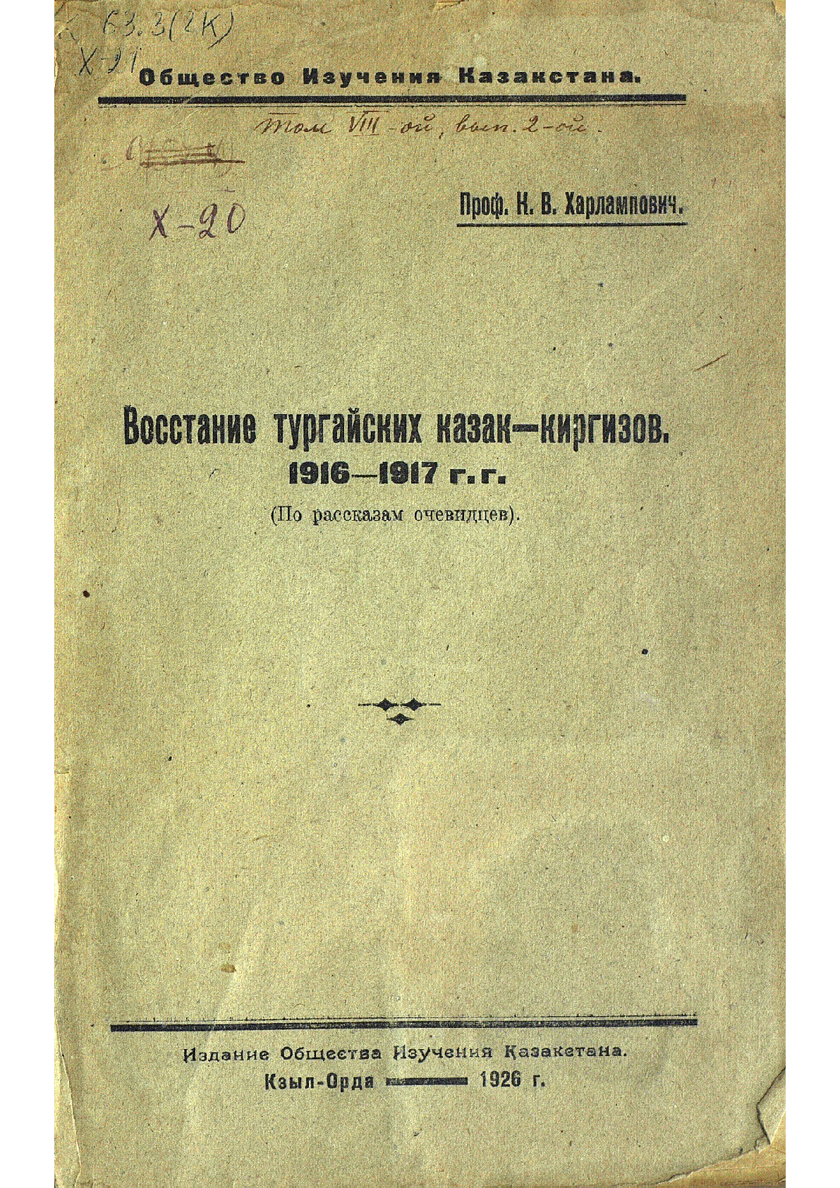 Восстание тургайских казак-киргизов, 1916-1917 г.г. [Текст] : (по рассказам очевидцев) / К. В. Харлампович ; [ред.: П. В. Иванов и др. ; отв. ред. А. Л. Малков] ; Общество изучения Казахстана... – Кзыл-Орда : Издание О-ва изучения Казакстана, 1926. - 41 с.– (Общество изучения Казакстана. - Загл. с обл. . . – 1000 экз. : 20 тг.