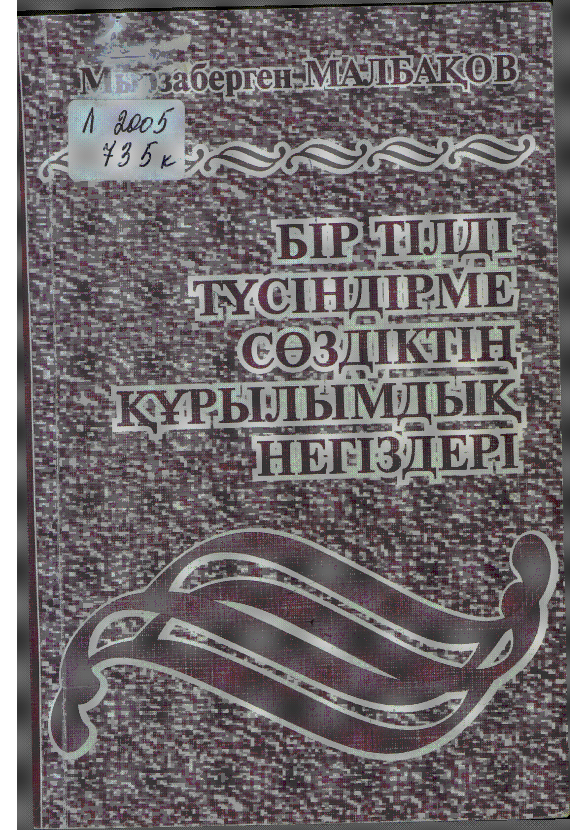 Бір тілді түсіндірме сөздіктің құрылымдық негіздері [Мәтін] / М. Малбақов ; [жауап. ред. Б. Әбілқасымов]... – Алматы : Ғылым, 2002. - 367 б. - Шора Сарыбаев қоры. - Автор қолтаңбасымен Ш. Сарыбаевқа тартуы . – Библиогр.: 354-364 б. . – 500 дана – ISBN 9965-08-042-9 : 800 тг.