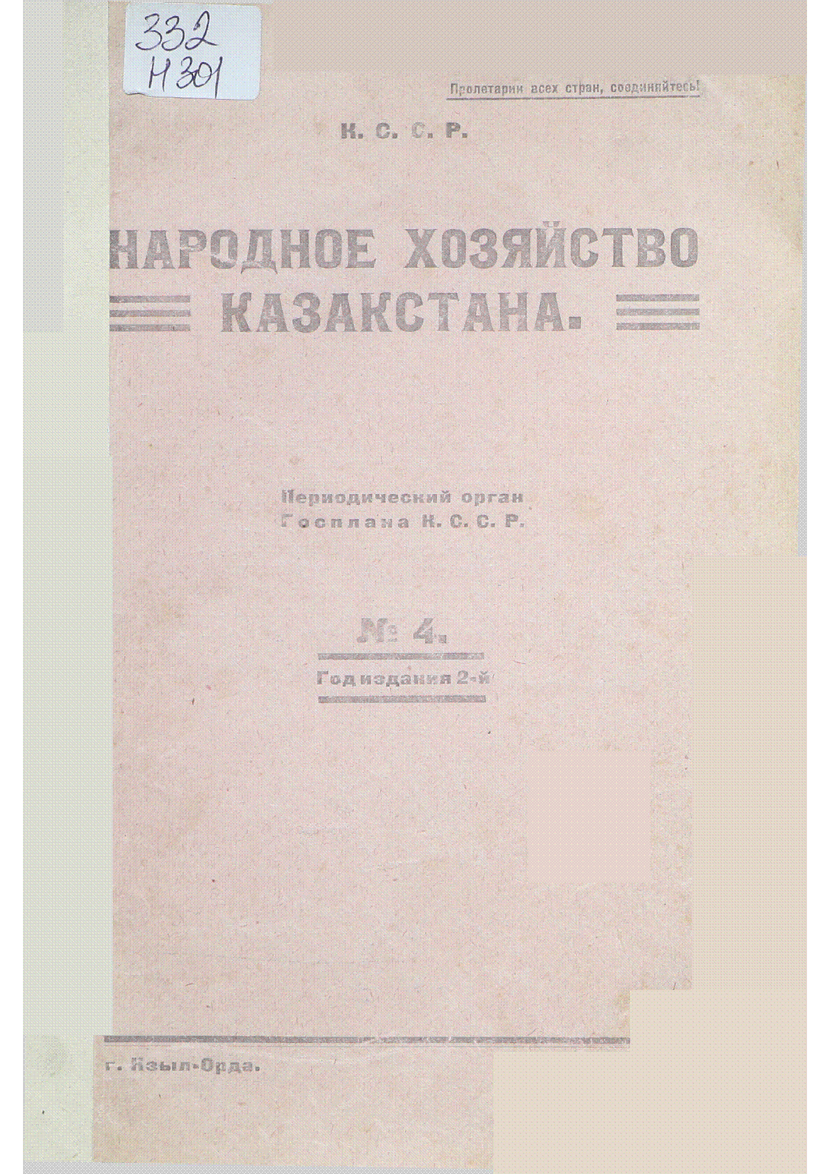 Народное хозяйство Казахстана [Текст] : Периодический орган Госплана К.С.С.Р.- Кзыл-Орда : Краевая типография № 1 , 1927.– 600 экз. . Ч. 4 .– 162 с., табл. . : 50 тг.