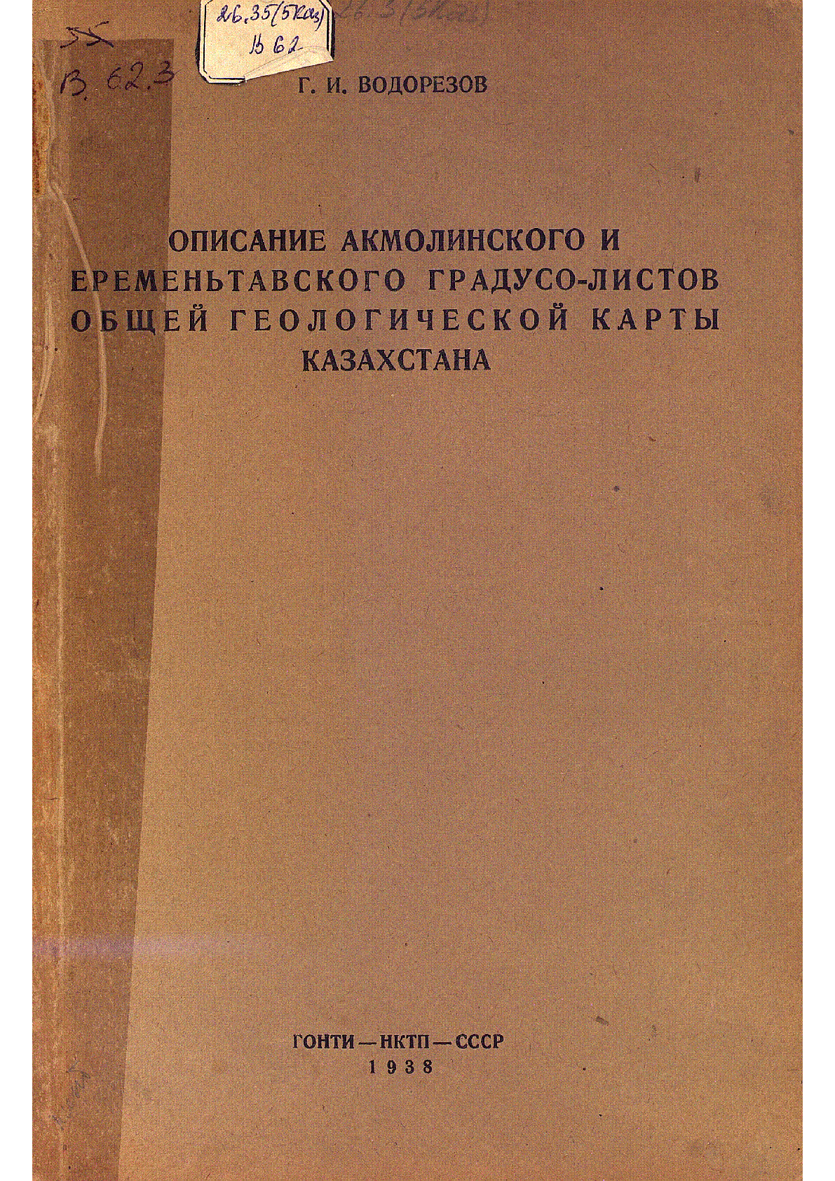 Описание Акмолинского и Еременьтавского градусо-листов общей геологической карты Казахстана / Водорезов, Г. И. ... – Ленинград ; Москва : ГОНТИ НКТП СССР, 1938. - 71, [1] c.– (Материалы по геологии и полезным ископаемым Казахстана. ; Вып. 3 . – Библиогр.: с. 70 . – не указан