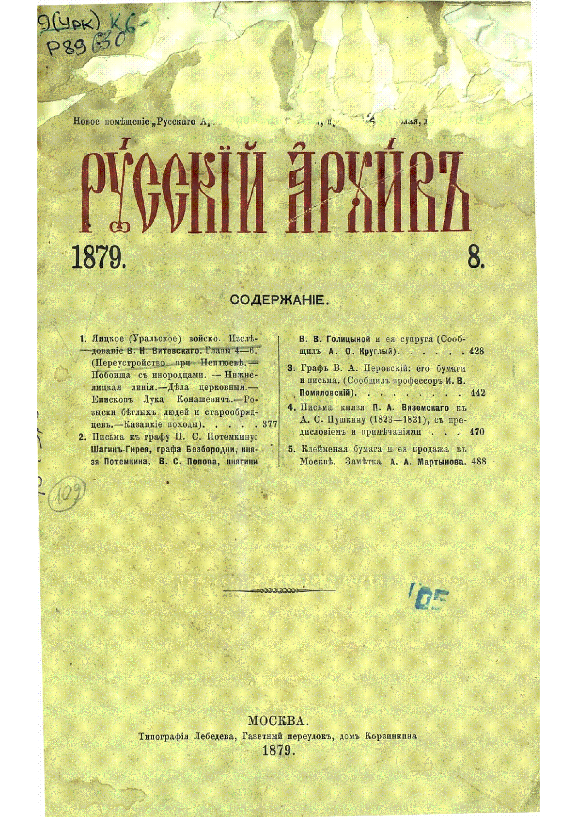 Издание содержит восьмой номер за 1879 год "Русского архива" , содержащий исследования Яицкого (Уральского) войска, проведенные В. Н. Витевским; письма к графу П. С. Потемкину; письма князя П. А. Вяземского к А. С. Пушкину и др.