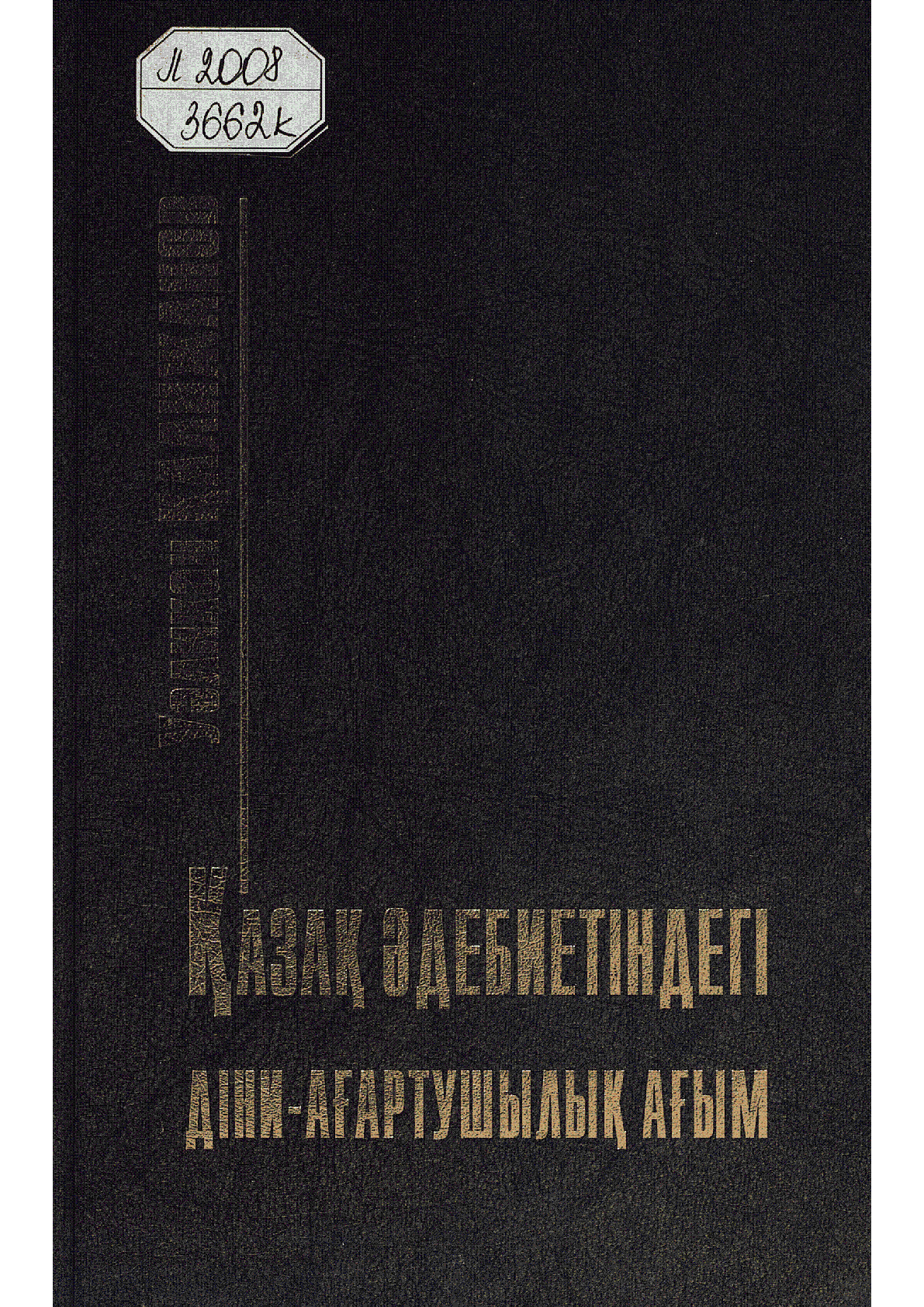 Қазақ әдебиетіндегі діни-ағартушылық ағым [Мәтін] / У. Қалижанов ; жалпы редакция З. Қабдолов .- Алматы : Құс Жолы , 2008.– 1000 дана . – ISBN 978-601-7074-05-0 (мұқ.) - Мырзатай Жолдасбеков қоры . 3-том . (ХІХ ғасырдың ортасы мен ХХ ғасырдың басы)– 286, [1] б. (мұқ.) : 0 тг.